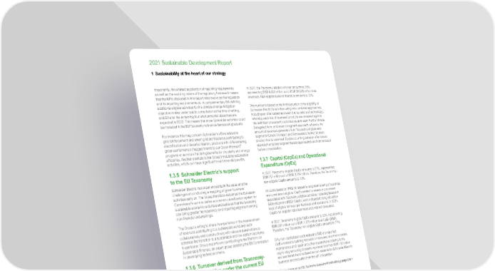 www.se.com Schneider Electric 14 2021 Sustainable Development Report 1 Sustainability at the heart of our strategy Importantly, the phased application of reporting requirements, as well as the evolving nature of the regulatory framework means that the KPIs disclosed in this report may evolve as the regulation and its reporting requirements do. A complementary DA defining additional eligible activities for the climate change mitigation objective is also under public consultation at the time of writing, and DAs for the remaining four environmental objectives are expected in 2022. This means that more Schneider activities could be included in the EU Taxonomy reference framework gradually. For instance this may concern Schneider’s offers related to grid reinforcement and smart grid architectures contributing to electrification and decarbonization, products with differentiating green performance (flagged thanks to our Green Premium ™ program) or services that bring benefits for circularity and energy efficiency. Another example is the Group’s industrial automation activities, which can have significant environmental benefits. 1.3.5 Schneider Electric’s support to the EU Taxonomy Schneider Electric has experienced both the value and the challenges of conducting a mapping of green business activities early on. The Group therefore welcomes the European Commission’s work to define a common classification system for sustainable economic activities and believes that the taxonomy can bring greater transparency and reporting alignment among non-financial undertakings. The Group is willing to share its experience in the measurement of revenues contributing to a sustainable world and work collaboratively and constructively with relevant stakeholders to advance the transition to a sustainable and low-carbon economy. In particular, Group experts are contributing to the Platform on Sustainable Finance, an expert group assisting the EU Commission in developing technical criteria. 1.3.6 Turnover derived from Taxonomy- eligible activities under the current EU Climate Delegated Act Schneider Electric identified several business activities that are eligible according to the current EU Climate DA. We provide the list of those activities in our methodological note on page 160. In 2021, the Taxonomy-eligible turnover amounts to 28%, representing EUR 8,032 million out of EUR 28,905 million total revenues. Non-eligible turnover therefore amounts to 72%. This number is based on the first evaluation of the eligibility of Schneider Electric’s activities using two combined approaches, including an offer-based approach (i.e. by nature of technology), whereby each line of business’ products are reviewed against the definition of economic activities as defined in the EU Climate Delegated Acts, and an end-segment approach, whereby the amount of revenues generated from Taxonomy-eligible end- segments (Green Transport and Renewables mainly) for each product line is reviewed. Double-counting between offer-based approach and end-segment-based approaches are then removed before consolidation. 1.3.7 Capital (CapEx) and Operational Expenditure (OpEx) In 2021, Taxonomy-eligible CapEx amounts to 27%, representing EUR 757 million out of EUR 2,764 million. Therefore, the Taxonomy- non-eligible CapEx amounts to 73%. All costs based on IFRS 16 related to long-term leasing of buildings are considered eligible. CapEx related to assets or processes associated with Taxonomy-eligible activities, including Research & Development (R&D) CapEx, were calculated using allocation keys of eligible turnover per business and operations. In 2021, CapEx for eligible individual measures was not evaluated. In 2021, Taxonomy-eligible OpEx amounts to 23%, representing EUR 291 million out of EUR 1,276 million total OpEx (R&D). Therefore, the Taxonomy non-eligible OpEx amounts to 77%. Only non-capitalized costs related to R&D are reported. OpEx related to building renovation measures, short-term leases, maintenance and repair and other expenditures relating to the day-to-day servicing of assets represent less than EUR 116 million and are therefore considered as non-material for Schneider Electric business and excluded from the KPI calculation. Read more on our EU Taxonomy assessment methodology page 216 Spotlight on Sustainability Consulting Schneider’s sustainability consulting business brings together the full portfolio of Schneider Electric solutions to provide unparalleled, end-to-end support to our customers to achieve their net-zero, sustainable transformations, from formulating climate strategy to execution & deployment of sustainability offers. For example, Schneider Electric is helping the VELUX Group, the world leader in roof windows and skylights, to develop a global program to successfully reduce their energy use and scale renewable capacity at each of the company’s factories. The project, which is designed to support VELUX Group in reaching its company carbon neutral goal by 2030 and accelerate its plan to be Lifetime Carbon Neutral, includes the energy assessment of all factory sites resulting in the development and implementation of Zero Carbon Action plans, support of its Energy Excellence program in accordance with ISO50001, improved energy efficiency, expansion of onsite renewable heating and electricity capacity to phase out fossil fuels, and implementation of a global monitoring system through Schneider Electric’s EcoStruxure ™ Resource Advisor to measure and analyze energy usage.