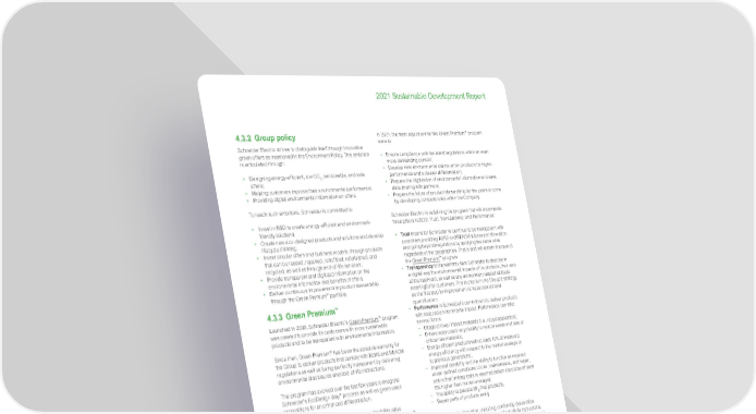 101 Life Is On | Schneider Electric www.se.com 2021 Sustainable Development Report 4.3.2 Group policy Schneider Electric strives to distinguish itself through innovative green offers as mentioned in the Environment Policy. This ambition is articulated through: • De signing energy-efficient, low CO 2 , serviceable, and safe offers; • Hel ping customers improve their environmental performance; • Pr oviding digital environmental information on offers. To reach such ambitions, Schneider is committed to: • In vest in R&D to create energy-efficient and environment- friendly solutions; • Cr eate new eco-designed products and solutions and develop lifecycle thinking; • In vent circular offers and business models, through products that can be reused, repaired, retrofitted, refurbished, and recycled, as well as through end-of-life services; • Pr ovide transparent and digitized information on the environmental information and benefits of offers; • Del iver continuous improvement in product stewardship through the Green Premium ™ portfolio. 4.3.3 Green Premium ™ Lau nched in 2008, Schn eider Electric’s Green Premium ™ program was created to provide its customers with more sustainable products and to be transparent with environmental information. Since t hen, G reen P remium ™ has been the absolute warranty for the Group to deliver products that comply with RoHS and REACH regulations a s well a s being p erfectly t ransparent b y del ive ring environmental d isclosures a nd en d-of-life i nstructions. The program has evolved over the last few years to int egrate Schneider’s EcoDesign Way ™ process as well as green value propositions for an enhanced differentiation. As a n e xample, S chn eider em bedded ne w durability v alue propositions such as the “take-back” program in Green Premium ™ . Customers w ho have purchased o ne of the A PC Un interruptable Power S upplies ( UPS) ha ve ac cess t o complimentary r ecycling when the battery in the product reaches its end of usable life. In 2021, this service collected around 14,000 tonnes of batteries globally f or r ecycling. In 2021, the main objectives for the Green Premium ™ program were to: • En sure compliance with the latest regulations within an even more demanding context; • De velop new environmental claims within products for higher performance and a clearer differentiation; • Pr epare the digitization of environmental information and ease data sharing with partners; • Pr epare the future of product stewardship for the years to come by developing competencies within the Company. Schneider Electric is redefining the program that will encompass three pillars in 2022: Trust, Transparency, and Performance: • Trust mea ns for Schneider to continue to be transparent with customers provi ding RoHS and REACH substance information a nd going beyond regulations by applying the same rules regardless of the geographies. That is and will remain the core of the Green Premium ™ program. • Transparency is the warranty from Schne ider to disclose in a digital way the environmental impacts of its products, th eir end- of-life treatment, as well as any environment-related attribute meaningful for customers. This is crucial in the Group’s strategy, as the first step for improvement is measurement and quantification. • P erformance is Schneider’s commitment to deliver products with reduced e nvironmental impact. Performance can take several forms: − Usage of lower impact materials (i.e., recycled plastics ); − Enhanced product recyclability to reduce waste and loss of critical raw materials; − E nergy efficient products with at least 10% of improved energy efficiency with respect to the market average o r t o previous generations; − I mproved durability and the ability to function as required under defined conditions of use, maintenance, and repair, until a final limiting state is reached (which should be at least 5% higher than market average); − The ability to provide SF 6 -free products; − Repair parts of products easily. Green Premium ™ information, including conformity declaration, Product Environmental Profiles (PEP), and End of Life Instructions, are digitally available 24/7 for customers in the technical data sheet of the online catalog, in the mySchneider mobile app, and on the “Check a Product” website at https://checkaproduct.se.com/. Digital environment disclosure (PEP) Lower Impact Materials Recyclability Circularity Profiles to provide guidance on responsible product end-of-life treatments Energy efficiency Durability Transparent environment attributes (ie. Mercury-/Lead-/PVC-free) Sustainable packaging SF 6 -free Reparability Transparency Minimal use of hazardous substances in, and beyond, compliance with regulations (RoHS, REACH). Tr ust Performance