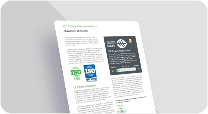 www.se.com Schneider Electric 96 2021 Sustainable Development Report 4 Being efficient with Resources The Group’s environmental reporting scope and targets are based on all ISO 14001 sites. Environment reporting metrics include energy consumption, Scope 1 and 2 CO 2 emissions, waste generation, water consumption, and VOC emissions at ISO 14001 sites. Schneider Electric also leverages ISO 50001 certification to drive energy excellence, focusing on the highest energy-consuming sites. ISO 50001 certification is complementary to ISO 14001 certification and enables us to define and sustain robust energy governance. With the support of this certification, the sites are equipped to understand and reduce their energy footprint. The Group aims to ISO 50001-certify all sites consuming over 5 GWh per year. By the end of 2021, 140 sites were certified ISO 50001. 4.2.5 Waste to Resources In 2021, global challenges with supply chains, material shortages, and increased visibility towards waste pollution such as ocean plastics have reaffirmed what Schneider Electric has known and strived towards for years: the depletion of the Earth’s resources in the current linear take-make-dispose models of resource consumption are not economically or environmentally sustainable and must be replaced with circular economy models. In its previous program, Towards Zero Waste to Landfill, the Group put a strong emphasis on diverting waste from the landfills through alternative solutions. The Group achieved 206 sites meeting its stringent requirements of 99% metal waste recovery, 97% non- metal waste recovery, and 100% hazardous waste recovery using the best available handling/treatment options available locally. This helped the Group to achieve 96% waste recovery across its operations overall. 2017 2018 2019 2020 2021 2030 94% 95% 95% 96% 96% 100% 100% Waste Recovery Performance NAM Europe APAC Rest of the World Target 200 ‘Waste-to-Resource’ sites Schneider Electric is driven to maximize the value of its resources, considering waste as a resource and ensuring its waste stays within a circular system. Beyond avoiding landfill and looking at traditional recycling solutions, Schneider strives to move up the waste hierarchy and find reduce and reuse solutions for its resources. Resources SSE #9 200 120 Baseline 2025 target 2021 Progress 0 100 126 In its new program, ‘Waste-to-Resource’, Schneider pushes even further with its waste recovery ambitions. Sites now must achieve 99% recovery for all non-hazardous waste and still achieve 100% hazardous waste recovery using the best available handling/ treatment options locally. Additionally, to promote and emphasize the importance of circular economy, ‘Waste-to-Resource’ sites will not be allowed to use waste-to-energy solutions for more than 10% of their waste. This provides an opportunity for sites to work collaboratively within their internal supply chains, along with external suppliers and waste management providers to find innovative reduce, reuse, and recycle solutions. ‘Waste-to-Resource’ ambition at Schneider: maximising value recovered from waste in sites Waste to Energy <10% Landfill <1% >90% Reduce, Reuse, Recycle