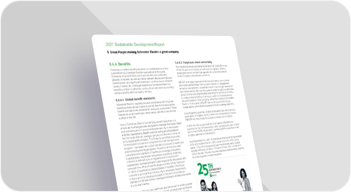 www.se.com Schneider Electric 128 2021 Sustainable Development Report 5 Great People making Schneider Electric a great company 5.4.4 Benefits Company provided benefits represent a considerable business commitment by Schneider Electric everywhere in the world. Schneider ensures that all employee benefits are locally and globally compliant, as well as market relevant. Because employee benefit plans vary significantly between countries due to different levels of social, tax, and legal regulations, Schneider Electric’s benefits portfolio is primarily country-driven and aims at providing similar benefits within a country territory. 5.4.4.1 Global benefit standards Schneider Electric regularly reviews compliance with its global benefit policies and principles to ensure that its inclusive global benefit standards are delivered for everyone, everywhere. These standards cover healthcare, family leave, and life cover and are audited in the SSI. One of Schneider Electric’s underlying benefit objectives is to ensure all its employees are equipped to manage their basic health and well-being and to provide adequate security to employees and their dependents. Health and well-being are embedded in the Schneider Electric strategic people priorities and contribute to its sustainability mission. The Group is committed to provide its employees access to a comprehensive well-being at work program – translated into a dual standard of access to healthcare and well-being training programs. Access to an inclusive and comprehensive standard of healthcare coverage (outpatient, hospitalization, key health risks/chronic conditions, maternity, children) is defined by local regulations and employment agreements. Schneider Electric also supports its employees with personal time off at critical life stages and this is fully deployed in 100% of countries as detailed below. In addition, the Group commits to provide financial security to employee dependents, in the event of an employee’s death, in the form of a minimum standard of life assurance coverage of at least a multiple equivalent to one year’s salary. Schneider Electric has reaffirmed and enhanced its existing global benefit standards outlined above for all our employees worldwide, for the duration of the COVID-19 crisis. This included a global extension of care leave from one to two weeks for our employees to care for their dependents diagnosed with COVID-19. Global Family Leave Policy As part of being a caring and responsible employer, Schneider Electric launched its global family leave policy along with care leave in 2017. With its industry-leading Global Family Leave Policy, Schneider Electric supports employees with personal time at critical life stages and empowers everyone to manage their “unique life and work” so that they can be at their best. While the Group’s countries have flexibility to define eligibility and policy details per statutory/market requirements, the policy sets global minimum standards: • Fully paid parental leave (primary parent – 12 weeks, secondary parent – 2 weeks); • Care leave (for sick/elderly relatives – 1 week); and • Bereavement leave (1 week). All benefits eligible employees have access to this global policy. 5.4.4.2 Employee share ownership The Worldwide Employee Share Ownership Plan (WESOP) is one of the Group’s recurring key annual reward programs, offering employees across the world an opportunity to become owners of the Company, at preferred conditions. WESOP is strongly ingrained in the Group’s culture, as a cultural and reward differentiator with a positive impact on engagement, attraction and retention. Schneider Electric has strongly developed and reinforced its offer over the years in order to build a sustainable group of employee shareholders reflecting the workforce diversity, to create a strong feeling of belonging, and to link employees to the performance of the Company, acting like owners of Schneider Electric. In that spirit, WESOP has become part of the Group sustainability commitments towards its 2025 roadmap (SSE #19). In participating countries, eligible employees have the chance to participate. All eligible country teams are collaborating to deploy WESOP and they made its success possible over the years. In 2021 the Group successfully reintroduced WESOP in 40 countries for the 25 th anniversary, after cancelling the plan in 2020 due to the COVID-19 pandemic, achieving 59% subscription rate, a higher rate than in 2019 at 50%. As of December 31, 2021, the employee shareholding represented 3.6% of Schneider Electric SE’s capital and 6.3% of the voting rights. 77% of the Group employee shareholders were located outside of France, of which 13% are in China, 15% in India, and 10% in the US. This also includes employee shareholding resulting from the long-term incentives grants.
