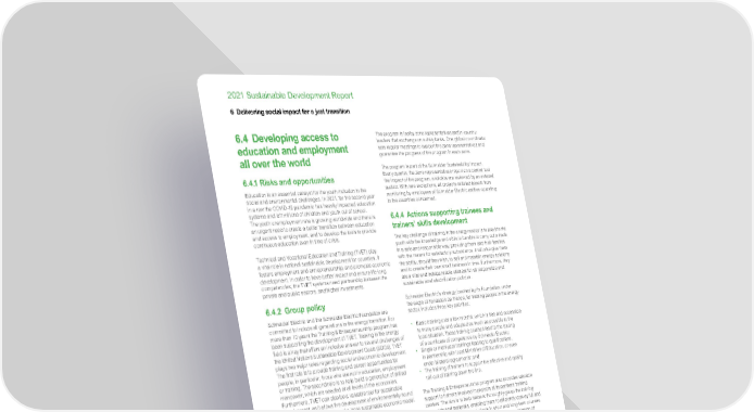 www.se.com Schneider Electric 144 2021 Sustainable Development Report 6 Delivering social impact for a just transition 6.4 Developing access to education and employment all over the world 6.4.1 Risks and opportunities Education is an essential catalyst for the youth inclusion in the social and environmental challenges. In 2021, for the second year in a row the COVID-19 pandemic has heavily impacted education systems and left millions of children and youth out of school. The youth unemployment rate is growing worldwide and there is an urgent need to create a better transition between education and access to employment, and to develop the tools to provide continuous education even in time of crisis. Technical and Vocational Education and Training (TVET) play a vital role in national sustainable development for countries, it fosters employment and entrepreneurship, and promotes economic development. In order to have better impact and ensure life-long competencies, the TVET systems need partnership between the private and public sectors, and higher investments. 6.4.2 Group policy Schneider Electric and the Schneider Electric Foundation are committed to include all generations in the energy transition. For more than 10 years the Training & Entrepreneurship program has been supporting the development of TVET. Training in the energy field is a key that offers an inclusive answer to several challenges of the United Nations Sustainable Development Goals (SDGs). TVET plays two major roles regarding social and economic development. The first role is to provide training and career opportunities for people, in particular, those who are not in education, employment or training. The second role is to help build a generation of skilled manpower, which are needed at all levels of the economies. Furthermore, TVET can also be a valuable tool for sustainable development, as it allows the development of environmentally sound skills, critical for shifting toward a more sustainable economic model. The program has a specific focus on impacting people not in education, employment, or training, the youth, refugees, women in vulnerable situations, and marginalized groups of people. The actions are always implemented in partnership with local players and/or national or international non-profit organizations (NGOs, governments, etc.) and with Schneider Electric’s local subsidiary. Thanks to the ecosystem of partners, the program has supported the training of more than 300,000 people across Asia, South America, Africa, and Middle East since 2010. More than 5,000 trainers and 4,000 entrepreneurs have also been supported. The COVID-19 pandemic has heavily impacted education and increased inequalities. We are committed to go further and faster by reaching one million people trained by 2025, 10,000 entrepreneurs supported, and 10,000 trainers trained. From now on, the program will also operate in OECD countries. 6.4.3 Governance The Training & Entrepreneurship program follows the rules and governance of the Schneider Electric Foundation and Fondation de France . To increase effectiveness in following up the partnerships and achieve the 2025 ambition, the program organizes every six months zone meetings with the zone President, the Foundation representatives, and the Training & Entrepreneurship program leaders. Each zone has a defined ambition up to 2025 and a pipeline of projects that is reviewed. Corrective actions are implemented if necessary. The program is led by zone representatives and in-country leaders that exchange on a daily basis. One global co-ordinator sets regular meetings to support the zone representatives and guarantee the progress of the program in each zone. The program is part of the Schneider Sustainability Impact. Every quarter, the zone representatives report on a central tool the impact of the program, and data are reviewed by an external auditor. With rare exceptions, all projects-initiated benefit from monitoring by employees of Schneider Electric entities operating in the countries concerned. 6.4.4 Actions supporting trainees and trainers’ skills development The key challenge of training in the energy sector is to provide the youth with the knowledge and skills to be able to carry out a trade in a safe and responsible way, providing them and their families with the means for satisfactory subsistence. It will also give them the ability, should they wish, to sell and maintain energy solutions and to create their own small business in time. Furthermore, they are a vital and indispensable element for all responsible and sustainable rural electrification policies. Schneider Electric’s strategy, backed by its Foundation, under the aegis of Fondation de France , for training people in the energy sector, includes three key priorities: • Basic training over a few months, which is free and accessible to many people and adapted as much as possible to the local situation. These training courses lead to the issuing of a certificate of competence by Schneider Electric; • Single or multi-year trainings leading to qualifications, in partnership with local Ministries of Education, or even under bilateral agreements; and • The training of trainers to support the effective and quality roll-out of training down the line. The Training & Entrepreneurship program also provides valuable support to trainers involved in projects at its partners training centers. The aim is to help trainers thoroughly grasp the training approach and materials, enabling them to efficiently convey full and relevant knowledge to the students in short and long-term courses. Training of trainers ensures effective long-term transmission of quality, up-to-date knowledge finely tuned to the characteristics of today’s energy markets in the host country. Training of trainers is supported by the VolunteerIn association via missions at the partners training centers: “I helped to create an entire training module using a pragmatic and 