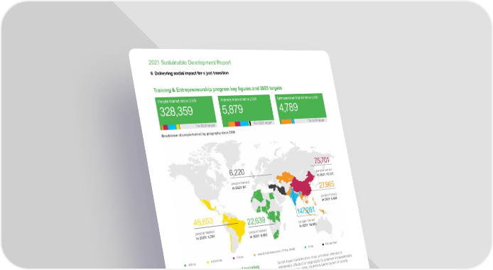 www.se.com Schneider Electric 146 2021 Sustainable Development Report 6 Delivering social impact for a just transition 6.4.9 Impact assessment of training actions In 2019, the Schneider Electric Foundation launched a global initiative to assess the social impact of training actions in the energy sector. With its partner KiMSO, the Group built a guidebook intended to support its local partners in assessing, in a standardized way, the social impact of their training activities. The pilot phase was carried in several centers. The roll-out program was shelved because of the health crisis, leading to the temporary closure of many centers. KiMSO is a social impact assessment consulting firm that helps charities, NGOs, and Foundations to understand, measure and value their impact on key stakeholders. The project covers both social impact assessment and results chain analysis. Social impact consists of the direct or indirect, intended or unintended, effects of an organization’s actions on its stakeholders (i.e., beneficiaries, users, volunteers, partners) and on society in general. Social impact assessment refers to the process of monitoring, analyzing, and managing those social consequences, which can be both positive and negative. This is an evaluative process aiming at answering the following key question: what changes thanks to us? Results chain analysis establishes causal relationships from the resources used to conduct a program to the long-term effects following the end of the program. It sets out a logical and plausible outline of how a sequence of inputs and outputs interacts with individuals’ behavior and conditions to generate outcomes. People trained since 2009 328,359 Entrepreneurs trained since 2009 4,789 Trainers trained since 2009 5,879 0 2000 4000 6000 8000 10000 0 2000 4000 6000 8000 10000 1m 2025 target 10k 2025 target 10k 2025 target Training & Entrepreneurship program key figures and 2025 targets Breakdown of people trained by geography since 2009 Africa Americas China Asia & Indonesia (excl. China, India) India Middle East 48,653 people trained in 2021: 1,761 22,639 people trained in 2021: 6,961 147, 2 8 1 people trained in 2021: 14,861 75,701 people trained in 2021: 17,271 2 7, 8 6 5 people trained in 2021: 5,681 6,220 people trained in 2021: 87