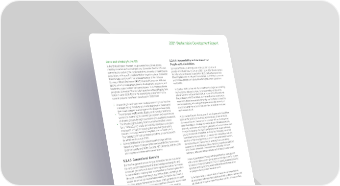 117 Life Is On | Schneider Electric www.se.com 2021 Sustainable Development Report Race and ethnicity in the US In the United States, the past couple years have driven strong visibility on racial and social injustices. Schneider Electric USA has committed to evolving the racial and ethnic diversity of its employee population, with specific representation targets in place. Schneider Electric USA continues to be a proud member of the National Society of Black Engineers (NSBE) Board of Corporate Affiliates (BCA), which provides recruitment, development, exposure, and leadership opportunities for its employees. To further accelerate progress, Schneider Electric USA launched a Racial Equity Task Force in June 2020. Under the stewardship of the Task Force, several projects have been developed in 2020/2021: • A sounding board team was created, examining how frontline manager hiring decisions are made and whether biases exist that create barriers to advancement for Black professionals; • The employee-led Diversity, Equity, and Inclusion task force worked on examining the current perceptions and experiences of diverse groups through quantitative and qualitative measures; • The Psychological Safety task force team identified a need for a “Safety Zone,” a safe and confidential space to support employees on topics impacting their psychological safety (racism, microaggressions, inequities, mental health, etc.). The “Safety Zone” will be implemented into a new US benefit for all US employees in 2022. • Schneider Electric USA debuted partnerships with two Historically Black Colleges & Universities (HBCUs), Tennessee State University and North Carolina A&T University, with the goal of hiring more diverse early-career talents. 5.2.4.3 Generational diversity For the five generations working at Schneider, the aim is to foster life-long career development and knowledge exchange for and across all generations to boost learning and innovation. Schneider is committed to creating new opportunities for the next generation (through, among other things, apprenticeships, internships, as well as its annual global student contest, Schneider Go Green in the City) and to harnessing the power of all generations, through tailored career development opportunities offered for each career stage (career week, coaching, development plans, reverse mentoring, etc.). Generation breakdown 36% 47% 10% 7% Gen Y (Millennials) Gen X Baby Boomers Gen Z 5.2.4.4 Accessibility and inclusion for People with disabilities Schneider Electric is strongly committed to the inclusion of people with disabilities. In January 2021, Schneider Electric joined the International Labour Organization (ILO) Global Business and Disability Network and signed their charter, committing to promote and include people with disabilities throughout their operations worldwide. In October 2021, in line with its commitment to digital accessibility, the Company debuted a new, more accessible version of its official website. In December 2021, in honor of the International Day of People with Disabilities, Schneider Electric organized a week-long global awareness campaign on the topic of disability and accessibility, educating employees about the diversity of disabilities and the actions allies can take to build an inclusive environment for all. At Schneider Electric France, overall, employees with disabilities account for 5.25% of the direct workforce (as of end of 2020). Schneider Electric France worked closely with a diverse panel of partnerships to develop the employment of disabled people, internally and externally, including targeted schools or universities in order to develop the visibility of professional opportunities to young talents with disabilities. In 2021, the Company remained committed to the recruitment of people with disabilities, with the addition of 24 new apprentices and 11 new permanent workers. Schneider Electric France keeps a strong focus on raising awareness of invisible disabilities including cognitive disabilities and chronic diseases. The awareness campaign includes webinars, educational materials as well as specific web series. A new Agreement on People with Disabilities has been signed with unions in December, giving means and objectives for 3 years focused on more recruitments (100 in 3 years), more accessibility (physical and digital) and more collaborative actions to allow employees facing health issues to work. To facilitate better communication in the context of the pandemic, all employees with hearing disabilities as well as their co-workers are still fitted with “inclusive masks” that allow visibility of the lower face. 5.2.4.5 LGBT+ inclusion In March 2018, Schneider Electric committed to the United Nations Free and Equal Standards of Conduct for Business on Tackling Discrimination against Lesbian, Gay, Bi, Trans and Intersex People, standing up for equal rights and fair treatment for LGBT+ people everywhere. By adopting these standards, the Group pledges to respect and stand up for the human rights of LGBT+ workers, customers, and members of the public; to support our LGBT+ employees and to prevent discrimination, including workplace discrimination, against LGBT+ people. In June 2019, during Pride Month, the Company announced the launch of its global LGBT+ Employee Resource Network (ERN): Schneider LGBT+ and Allies. The Group is open to all – LGBT+ people and allies alike – with an interest to further inclusion in the workplace. In October 2020, in addition to its (virtual) celebration of Pride Month, Schneider Electric held its first global LGBT+ Awareness Month. Each week, video testimonials, podcasts, and educational materials were provided to all employees interested in learning and hearing from their LGBT+ colleagues. In June 2021, the Company celebrated Pride Month globally, with a campaign that focused on the concept of intersectionality.
