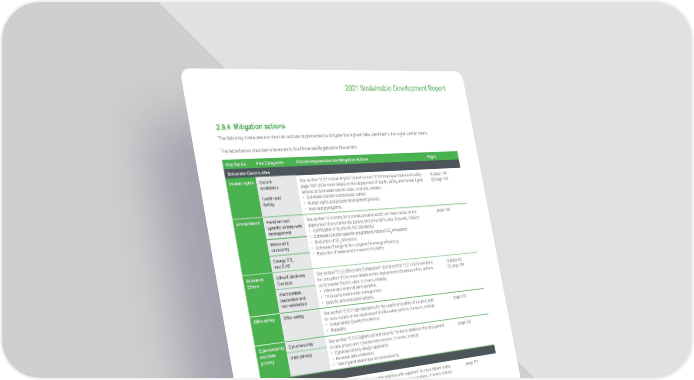 59 Life Is On | Schneider Electric www.se.com 2021 Sustainable Development Report 2.9.4 Mitigation actions The following measures are the main actions implemented to mitigate the highest risks identified in the vigilance risk matrix. The table below provides references to the Universal Registration Document. Key Topics Risk Categories Policies implemented and Mitigation Actions Pages Schneider Electric sites Human rights Decent workplace See section “2.2.7 Human Rights” (i) and section “2.2.8 Employee health and safety page 109” (ii) for more details on the deployment of health, safety, and human rights actions on Schneider Electric sites. It covers, notably: • Schneider Electric’s employees’ safety; • Human rights and people development policies; • Well-being programs. (i) page 106; (ii) page 109 Health and Safety Environment Pollution and specific substances management See section “2.3 Acting for a climate positive world”, for more details on the deployment of environmental actions on Schneider’s sites. It covers, notably: • Certification of its sites to ISO standards; • Schneider Electric specific programs to reduce CO 2 emissions; • Reduction of SF 6 emissions; • Schneider Energy Action program for energy efficiency; • Reduction of waste and increased circularity. page 126 Waste and circularity Energy CO 2 and GHG Business Ethics Ethical Business Conduct See section “2.2.2 Ethics and Compliance” (i) and section “2.2.3 Zero-tolerance for corruption” (ii) for more details on the deployment of business ethics actions on Schneider Electric sites. It covers, notably: • Internal and external alert systems; • Third-party relationship management; • Specific anti-corruption actions. (i) page 95; (ii) page 101 Alert system, protection and non-retaliation Offer safety Offer safety See section “2.2.5 High standards for the quality and safety of our products” for more details on the deployment of offer safety actions. It covers, notably: • Sustainability Quality Excellence; • Reliability. page 102 Cybersecurity and Data privacy Cybersecurity See section “2.2.6 Digital trust and security” for more details on the deployment of data privacy and cybersecurity actions. It covers, notably: • Cybersecurity by design approach; • Personal data protection; • Training and awareness on cybersecurity. page 105 Data privacy Suppliers Suppliers Supplier vigilance See section “2.2.11 Sustainable relations with suppliers” for more details on the deployment of actions towards Schneider Electric’s suppliers. It covers notably: • Continuous Improvement process based on ISO 26000 standards; • Decent Work program for strategic suppliers; • Vigilance plan for suppliers; • Zero Carbon Project. p ag e 117 Subcontractors Sub- contractors Subcontractors vigilance See section “2.2.10 Relations with project execution contractors” for more details on the deployment of actions towards Schneider Electric’s subcontractors (or solution suppliers). It covers notably: • Integration of ESG into the project decision making; • Vigilance plan for project contractors. p ag e 116 Local Communities Local communities Around Schneider Electric sites See section “2.2.12 Vigilance with local communities” for more details on the deployment of health, safety, and human rights actions around Schneider Electric and customer projects sites. It covers, notably: • Risk mitigation around Schneider Electric sites; • Risk mitigation around customer project sites. page 124 Around customer projects sites