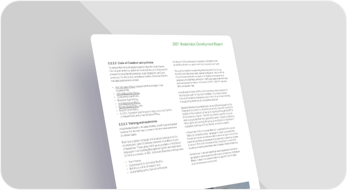 41 Life Is On | Schneider Electric www.se.com 2021 Sustainable Development Report 2.2.2.2 Code of Conduct and policies To ensure that the tools are provided to follow the Trust Charter, it is complemented by global and local policies, providing specific answers to the different principles, legal obligations, and local practices. On ethics and compliance matters, Schneider Electric has deployed several policies: • Anti-Corruption Policy (aligned with French Sapin II law requirements), • Gifts & Hospitality Policy, • Competition Law Policy, • Business Agent Policy, • Anti-Harassment Policy, • Human Rights Policy, and • Export Control Policy. • In 2021, Schneider published and rolled out a new Conflic t of Interest Policy and a new Donations Policy. 2.2.2.3 Training and awareness At Schneider Electric, we value training, at both local and global levels as it is the best way to prevent risks and raise awareness on ethical topics. Each year a global campaign of mandatory trainings is run for all employees, called Schneider Essentials , from March to end of September. These global trainings are available in 18 different languages in our Learning Management System and each takes 30 mins to complete. In 2021, Schneider Essentials trainings were: • Trus t Charter, • Cyber security for Schneider Electric, • Buil ding a culture of respect, and • Sust ainability at the Core of our Purpose. For about 40,000 employees exposed to corruption risks, an additional anti-corruption training is required each year. Through Schneider Sustainability Essentials #13, the Group monitors and discloses each quarter completion rate on ethics (Trust Charter and anti-corruption for eligible employees) and cybersecurity trainings, aiming for 100% each year and externally audit annual performance. At the end of 2021, SSE #13 reached 96% completion rate. A dedicated module on Ethics & Compliance was prepared for the induction path for Country Presidents. The module raises Country Presidents awareness about their role and responsibility in supporting the Ethics & Compliance program. Besides training of our employees, since 2020 and as part of the integration process of companies acquired, a specific training for leaders of the acquired company is organized through the Ethics & Compliance program. The training entails a specific focus on what is expected from the leadership teams, including endorsing the program and actively following up employees completion of mandatory trainings on Trust Charter and anti-corruption. In November 2020, Schneider Electric organized its first global “Ethics & Compliance Day” campaign in order to promote the Company’s values on business ethics and to bring a focus on the need of a working environment that promotes a speak-up culture. A second “Ethics & Compliance Day” took place in June 2021, focusing on raising awareness about biases of ethical thinking. Furthermore, in-person learnings were organized in sensitive geographic areas regarding ethics and compliance challenges (Brazil, India) or in locations where a specific risk is higher (such as the export control risk). 100% of employees trained every year on Cybersecurity and Ethics Feedback received from our employees confirm that our trainings efficiently help them to act as “integrity ambassadors”. Cybersecurity training: “Very much anchored in real life both professional and personal. Did not see the 30m pass. Way to go!” Principles of Responsibility training: “I love the fact that this course reminds you the basics and makes you use your brain and put yourself in the shoes of colleagues in difficult situations. Love the voice of so many of our colleagues too!” Anticorruption training: “The content is simple and easy to understand. This is a must for any Schneider employee.” Tr ust SSE #13 100% 90% Baseline 2025 target 2021 Progress 0 100 96%