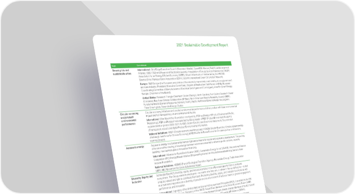 23 Life Is On | Schneider Electric www.se.com 2021 Sustainable Development Report Topic Commitment Smart grids and sustainable cities International : Grid Edge Executive Council (Greentech Media); OpenADR Alliance; Peak Load Management Alliance; IEEE (T&D and Power and Electronics Society); Association of Energy Service Professionals (AESP); Association for an Energy Efficient Economy (AEEE); Urban Infrastructure Initiative led by the WBCSD; Electric Drive Transportation Association (EDTA); ISGAN (International Smart Grid Action Network); Europe : T&D Europe (the European association of the electricity transmission and distribution equipment and services industry, President, Executive Committee), Orgalim (Infrastructure Task Force); CAPIEL (European Coordinating Committee of Manufacturers of Electrical Switchgear and Controlgear); smartEn (Smart Energy Europe, Chairman of the Board); United States : Research Triangle Cleantech Cluster (Raleigh, North Carolina); Fort Collins Cleantech Cluster (Colorado); Bay Area Climate Collaborative (SF Bay); North American Electric Reliability Council (NERC, Functional Model Demand Response Advisory Team); Pacific Northwest Demand Response program; Think Smart grids; Tenerrdis Energy Cluster. Circular economy and product environmental performance Circular economy initiatives and product environmental performance deliver product with lower environmental impact and full transparency on environmental attributes. International : Ellen MacArthur Foundation membership; PEP ecoPassport (Product Environment Profile, Presidency), PEP ecoPassport was selected by EU as leader of PEF (Product Environment Footprint) experimentation phase (2020-2021) for EEE cluster (Electric and Electronic Equipment), for promotion of transparent, robust and digital Product Environmental information; National Initiatives : AFEP (Circular economy working group); AFNOR Circular Economy; Gimélec (chairmanship of strategic taskforce for Circular Economy); MTES/Feuille de Route Économie Circulaire (active contributions, working groups). Access to energy Access to energy is a fundamental human right and a means for social and economic development. The pooling of forces and the sharing of knowledge between actors are essential to advance public policies, capacity building, new technologies or innovative financing. International : Alliance for Rural Electrification (ARE); Sustainable Energy for all (SE4ALL); International Finance Corporation (IFC) Energy2Equal initiative (Empowering Women in Africa’s Renewable Energy Sector); Solar Impulse Foundation. National Initiatives : ADEME (French Ecological Transition Agency); Renewable Energy Trade Association (SER); HEC Movement for Social & Business Impact. Diversity, Equity and Inclusion Schneider Electric’s diversity, equity, and inclusion ambition is to offer equal opportunities to everyone everywhere. The Group wants its employees – no matter who they are, or where in the world they live – to feel uniquely valued and safe to contribute their best. Promoting diversity, equity, and inclusion is a moral as well as a business imperative as a diversity of people and an environment of inclusion leads to greater engagement, performance, and innovation. International : Signatory of the United Nations Women’s Empowerment Principles (WEP); Committed to the UN Generation Equality Forum; Signatory of the OECD Global Deal; Member of the World Economic Forum (WEF) Partnership for New Work Standards; Signatory of the Women’s Forum climate charter; Member of the ILO Global Business and Disability Network (GBDN); Member of the Gender and Diversity KPI Alliance (GDKA). National Initiatives : Diversity Charter; Agreement for professional gender equality; Parenthood Charter; Disability Agreement; Agreement on inter-generational mechanism; Apprenticeship Agreement; Signatory of PaQte, a collective of companies working to be more inclusive with specific action plans for working-class neighborhood; Youth and regional development with associations (FACE, 100 Chances 100 Emplois, Energie Jeunes, ADIE, GEFLUC). Education International : Training program in energy management for disadvantaged people, in partnership with local vocational training centers and/or national or international non-profit organizations. National Initiatives : Schneider electric school, framework agreements with the Ministry of National Education, Higher Education and Research, partnerships with the continuing education network of UIMM, Ingénieurs Pour l’École network (IPE), selected by the Ministry of Education for the Digital School project. Ethics and human rights International : Transparency International, Global Compact LEAD (Decent Work in Global Supply Chains); Member and co-leader of the B4IG coalition’s “Advancing human rights in direct operations and supply chains” working group; IDH - The Sustainable Trade Initiative. National Initiatives : Cercle éthique des affaires (Business ethics club, Board of Directors); Club Droits Humains (Human rights club) of Global Compact France; Entreprises pour les droits de l’homme (Businesses for Human Rights). Biodiversity Livelihoods (carbon offset fund for biodiversity and rural communities), act4Nature Initiative; Caisse des Dépôts et Consignations (CDC) – Positive Biodiversity Businesses club (B4B+) membership. Philanthropy International : International Association for Volunteer Effort (IAVE), more than 70 NGOs supported each year in over 35 countries; The European Venture Philanthropy Association (EVPA). National Initiatives : Fondation de France , Admical ( Association pour le développement du mécénat industriel et commercial , member of the European network CERES); IMS- Entreprendre pour la cité ; Centre français des fonds et fondations ; Alliance pour le Mécénat de compétences . The Rénovons initiative/CLER the energy transition network; Hope, la chaire pour lutter contre la Précarité Energétique/Fo