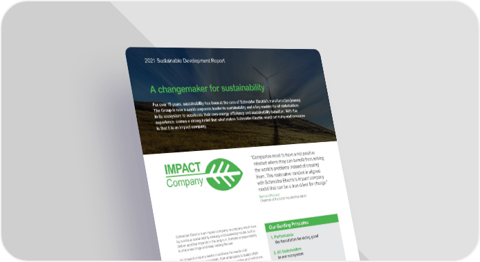 www.se.com Schneider Electric 2 2021 Sustainable Development Report 2021 Sustainable Development Report IMPACT Company A changemaker for sustainability For over 15 years, sustainability has been at the core of Schneider Electric’s transformation journey. The Group is now a world corporate leader in sustainability and a key enabler for all stakeholders in its ecosystem to accelerate their own energy efficiency and sustainability transition. With this experience, comes a strong belief that what makes Schneider Electric stand out today and tomorrow is that it is an impact company. Schneider Electric is an impact company, a company which lives by a unique sustainability strategy and operating model, built to deliver positive impacts in the long-run. It entails a responsibility to share learnings and keep raising the bar. An impact company seeks to address the needs of all stakeholders in its ecosystem, from employees to supply chain partners, customers, as well as local communities and institutions. To deliver sustainability in its entire value chain, it must combine a solid profitability with leading practice on all Environmental, Social and Governance dimensions. It means that an impact company has inherently aligned and integrated its purpose and its business mission to ensure its corporate value delivers on sustainability needs and ambitions. The company’s operating model is set up to impact on all of the above at global and local levels. Its culture builds on strong and practiced values with the right talent and processes to be a leading purpose-led company. An Impact model recognized in external ratings 1. Performance the foundation for doing good 2. All Stakeholders in our ecosystem 3. All ESG dimensions 4. Business digital partner for Sustainability and Efficiency 5. Model & Culture set up for global and local impact Our Guiding Principles “ Companies need to have a net positive mindset where they can benefit from solving the world’s problems instead of creating them. This restorative mindset is aligned with Schneider Electric’s impact company model that can be a true driver for change.” Bertrand Piccard Chairman of the Solar Impulse Foundation