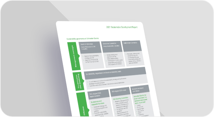 17 Life Is On | Schneider Electric www.se.com 2021 Sustainable Development Report 1.4.3 Diffusion 1.4.3.1 The Schneider Sustainability Impact Steering Committee In 2020, a specific SSI Steering Committee was created, with about 50 members: representants of each Executive Committee member, each geography, function, and business unit. Three all- hands workshops took place, and the sustainability team organized individual follow up interviews with each member to define precise and measurable programs for the 2021 – 2025 SSI. 1.4.3.2 SSI and SSE pilots and sponsors The execution of Schneider Sustainability Impact and Schneider Sustainability Essentials programs is ensured, for each program, by operational managers or “pilots”, and SVP-level as well as Executive Committee level sponsors. 1.4.3.3 Other key organizations Several other Committees and organizations drive progress on all pillars of the sustainability strategy, for instance: • Global Supply Chain organization, with responsibilities including safety and the environment; • Human Resources organization; • The Ethics & Compliance organization. Sustainability Fellows network, Volunteers, Schneider Electric Foundation delegates Board of Directors Human Resources & CSR Committee • Approve the sustainability strategy and SSI • Approve LTIP and STIP for the Chairman & CEO 360-degree ESG implementation Businesses and corporate functions • Implement strategy and Company programs and policies • Execute sustainability objectives (SSI, variable compensation) • Support awareness • Innovate 360-degree ESG vision SSI Steering Committee • Establish dialogue with the entire company to boost ambition, innovation and integrate all challenges • Co-develops new SSI programs • Representatives from Executive Committee, operational activities and central functions Network and expert committees Schneider Electric has expert committees* on dedicated and material topics, in particular: • Climate • Environment • Human rights • Governance • Ethics • Citizenship • Diversity & Inclusion All employees Executive Committee Group Sustainability Committee Stakeholder Committee • Validate strategy and alignment with the United Nations SDGs • Challenge and monitor global sustainability performance and progress of initiatives • Participate, challenge and oversee the execution of Schneider’s Purpose, Sustainability strategy and delivery of long- and short- term commitments Sustainability department and local sustainability leads • Co-ordinates and monitors the sustainability strategy and performance • Manage innovation projects • Lead the relationships between internal and external stakeholders Diffusion Co-ordination and monitoring Management oversight * Non-exhaustive list: Access to Energy Committee, Carbon Committee, SERE (Safety Environment Real Estate) Committee, Ethics Committee & Fraud Committee, Duty of Vigilance Committee, Foundation’s Executive Committee & Schneider VolunteerIn Board, HR Committee, Diversity & Inclusion Committee, SSI pilots, and sponsors. Sustainability governance at Schneider Electric