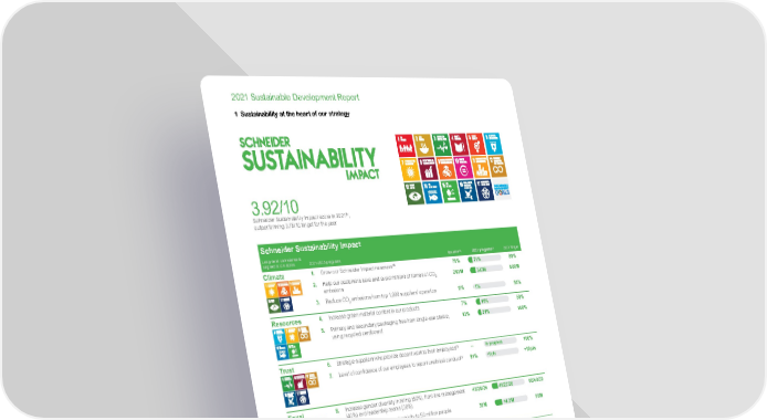 www.se.com Schneider Electric 8 2021 Sustainable Development Report 1 Sustainability at the heart of our strategy 3.92/10 Schneider Sustainability Impact score in 2021 (1) , outperforming 3.75/10 target for the year Schneider Sustainability Impact Long-term commitments aligned to UN SDGs 2021-2025 programs Baseline (2) 2021 progress (3) 2025 Target Climate 1. Grow our Schneider Impact revenues (4) 70% 0 100 71% 80% 2. Help our customers save and avoid millions of tonnes of CO 2 emissions 263M 0 100 347M 800M 3. Reduce CO 2 emissions from top 1,000 suppliers’ operation 0% 0 100 1% 50% Resources 4. Increase green material content in our products 7% 0 100 11% 50% 5. Primary and secondary packaging free from single-use plastic, using recycled cardboard 13% 0 100 21% 100% Tr ust 6. Strategic suppliers who provide decent work to their employees (1) -- In progress 100% 7. Level of confidence of our employees to report unethical conduct (1) 81% +0pts +10pts Equal 8. Increase gender diversity in hiring (50%), front-line management (40%) and leadership teams (30%) 41/25/24 0 100 41/27/26 50/40/30 9. Provide access to green electricity to 50 million people 30M 0 100 +4.2M 50M Generations 10. Double hiring opportunities for interns, apprentices and fresh graduates 4,939 0 100 x1.25 x2 11. Train people in energy management 281,737 0 100 328,359 1M Local +1. Country and Zone Presidents with local commitments that impact their communities 0% 100% 100% (1) The Schneider Sustainability Impact (SSI) provides an overall measure of the Group’s progress on its sustainability goals on a scoring scale of 10. This is achieved by converting each KPI’s performance on a 10-point scale, considering that base year performance receives a 3/10 score and the 2025 objective translates to a 10/10 score. For each KPI, the relevant score is obtained by linear interpolation and rounded down to the second decimal. The overall score of the tool is the average of each KPI’s score with equal weight excluding the local commitment (SSI #+1). As an exception, in 2021, two other KPIs are excluded: SSI #6, as the program is still in development, and SSI #7, because 2021 is the baseline year. (2) Generally, the 2020 performance serves as a baseline for SSI programs, except for two programs measured against a 2019 baseline to mitigate COVID-19 impacts (SSI #1 Impact revenues and SSI #10 opportunities for the next generation). (3) Each year, Schneider Electric obtains a “limited” level of assurance on methodology and progress from an independent third party verifier for all of the SSI indicators (except for SSI #6, SSI #7 and SSI #+1), in accordance with ISAE 3000 assurance standard (for more information, please refer to the Universal Registration Document). The 2021 performance is also discussed in more details in each section of this report. (4) For the reporting requirements under the European Taxonomy Regulation, please refer to page 12 and page 160.