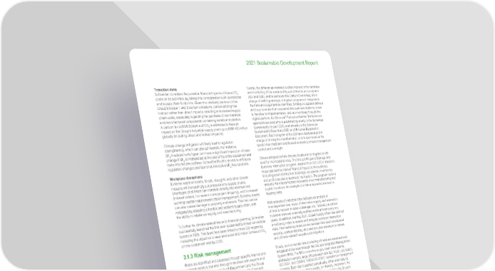 73 Life Is On | Schneider Electric www.se.com 2021 Sustainable Development Report Transition risks Schneider considers the possible financial impacts of future CO 2 costs on its activities, by taking into consideration both operational and supply chain footprints. Given the relatively low level of the Group’s Scope 1 and 2 carbon emissions, carbon pricing has indirect rather than direct impacts, resulting in increased supply chain costs, especially regarding the purchase of raw materials and manufactured components containing metals and plastics. A carbon tax at EUR 50/tonne of CO 2 is estimated to have an impact on the Group’s industrial supply chain up to EUR 420 million globally (including direct and indirect impacts). Climate change mitigation will likely lead to regulation strengthening, which can disrupt markets. For instance, SF 6 -insulated switchgear can have a significant impact on climate change if SF 6 is mishandled at the end of life of the equipment and leaks into the atmosphere. Schneider Electric strives to anticipate regulation changes and launches innovative SF 6 -free solutions. Workplace disruptions Extreme weather events, floods, droughts, and other climate impacts will increasingly put pressure onto supply chains. Shortages of all kinds can translate directly into revenue loss (missed orders), increased costs (urgent shipping), and increased working capital requirements (stock management). Extreme events can also cause damage to property and assets. This risk can be mitigated by adopting a flexible and resilient supply chain, with the ability to rebalance supply and manufacturing. To further tie climate-related issues to financial planning, Schneider successfully launched the first-ever sustainability-linked convertible bonds in 2020. This bond has been linked to three SSI targets by including the objective to save and avoid 800 million tonnes of CO 2 on the customers’ end by 2025. 3.1.3 Risk management Risks are identified and assessed through specific internal and external metrics, but also through interviews with experts and leaders, run by the Internal Audit Department and the Group Risk Management Department, to update the list of general risks at Group level each year. In 2021, around 40 of the Group’s top managers were interviewed in addition to Board members. Environment and climate-related risks are included in Schneider’s unique risk taxonomy (more details in the Universal Registration Document). Every three years, a materiality analysis is conducted by the Sustainability department, leveraging an external consultant, and complements the risk analysis with a focus on environment, social, and governance (ESG) topics and longer-term risks and opportunities. Overall, the different governance bodies involved in the definition and monitoring of the sustainability commitments and programs (SSI and SSE), and in particular the Carbon Committee, are in charge of defining strategic mitigation programs in response to the risks and opportunities identified. Strategic programs defined at Group level are then cascaded into business divisions, down to the sites for implementation, and are monitored through the digital platform, EcoStruxure ™ Resource Advisor. Performance against those programs is published quarterly in the Schneider Sustainability Impact (SSI), and annually in the Schneider Sustainability Essentials (SSE) and Universal Registration Document. Each program of the SSI has a dedicated pilot in charge of driving the transformation, and is sponsored at the Senior Vice-President and Executive levels to ensure management control and oversight. Climate adaptation risks are also studied and mitigated at site level for the industrial sites. The Group’s Property Damage and Business Interruption program, inspired from ISO 22301 standard, maps substantive risks of financial impact on the business, including asset destruction (buildings, equipment, inventories) and profit loss due to business interruption. The program reviews annually the natural hazard exposures of our manufacturing and logistic locations. An example of a risk analyzed at site level is flooding risks. Risk analysis of industrial sites includes an analysis of interdependencies, study of alternative supply, and estimation of time to recover in case of damage, etc. Typically, all critical industrial sites are externally audited onsite at least every two years. In addition, starting 2021, Global Supply Chain has defined a resiliency index to assess and mitigate business interruption risks. This resiliency index covers several risks (such as physical security, political stability, etc.) and includes exposure to natural and climate-related hazards and mitigations. Finally, environmental risks (including climate) are assessed and mitigated at site level through the Group’s Integrated Management System (IMS). The IMS covers the supply chain sites (plants, distribution centers, large offices) and hosts ISO 14001, ISO 50001, ISO 9001, and OSHAS 18000/ISO 45001 compliance management systems. Each site is audited periodically, either externally by Bureau Veritas (every three years), or internally. At present, the impact of climate-related matters is not material to the Group’s financial statements. With suppliers, sustainability risks (including natural and climate- related hazards), are embedded into Supplier Risk Assessment. This process enables to define risk mitigation action plans with suppliers, as well as prioritize double sourcing strategies. Leveraging external data providers, the Group monitors events across 10,000 nodes (such as ports and critical supplier locations) to shorten reaction time when events occur and minimize business impact.