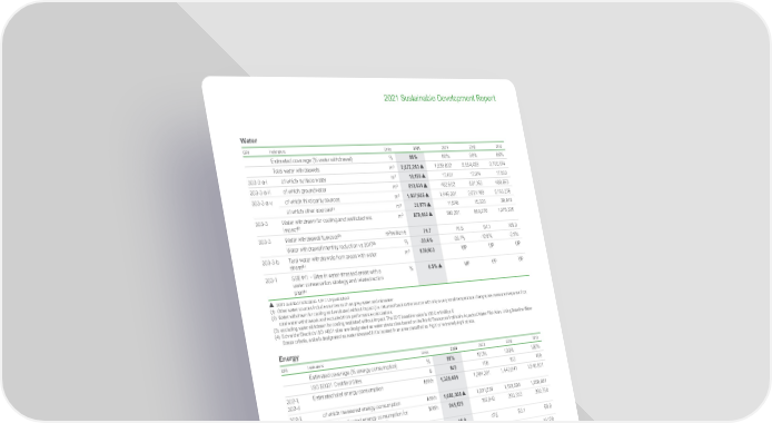 173 Life Is On | Schneider Electric www.se.com 2021 Sustainable Development Report Water GRI Indicators Units 2021 2020 2019 2018 Estimated coverage (% water withdrawal) % 86% 88% 88% 86% Total water withdrawals m 3 2,072,263 1,928,032 2,554,428 2,700,674 303-3-a-i of which surface water m 3 19,15 6 17, 4 61 17, 074 17, 9 9 3 303-3-a-ii of which groundwater m 3 513,631 452,602 501,163 490,563 303-3-a-v of which third party sources m 3 1,5 07,6 0 6 1,446,391 2, 0 21,16 8 2,16 3 , 2 76 of which other sources (1) m 3 31,870 11, 5 78 15,023 28,842 303-3 Water withdrawn for cooling and restituted w/o impact (2) m 3 879,602 780,201 880,276 1,376,335 303-3 Water withdrawal/Turnover (3) m 3 /million € 71.7 76.5 9 4 .1 105.0 Water withdrawal intentisy reduction vs 2017 (3) % -33.6% -2 9 .1% -12.9% -2.8% 303-3-b Total water withdrawals from areas with water stress (4) m 3 930,603 UP UP UP 303 -1 SSE #11 – Sites in water-stressed areas with a water conservation strategy and related action plan (4) % 8.5% UP UP UP 2021 audited indicators. UP = Unpublished. (1) Other water sources include sources such as grey water and rainwater (2) Water withdrawn for cooling and restituted without impact (i.e. returned back to the source with only a very small temperature change) are measured separate from total water withdrawals and excluded from performance calculations (3) excluding water withdrawn for cooling restituted without impact. The 2017 baseline value is 108.0 m 3 /million € (4) Schneider Electric’s ISO 14001 sites are designated as water stress sites based on the World Resources Institute’s Aqueduct Water Risk Atlas. Using Baseline Water Stress criteria, a site is designated as water stressed if it is located in an area classified as ‘high’ or ‘extremely high’ stress. Energy GRI Indicators Units 2021 2020 2019 2018 Estimated coverage (% energy consumption) % 99% 100% 100% 100% ISO 50001 Certified Sites # 140 150 153 168 302-1, 302-4 Estimated total energy consumption MWh 1,325,491 1,204,381 1,442,841 1,540,831 302-1, 302-4 of which measured energy consumption MWh 1,080,366 1,021,539 1,19 2, 5 0 8 1,258,081 of which estimated energy consumption for sites out of reporting perimeter (1) MWh 2 4 5 ,125 182,842 250,333 282,750 302-1, 302-4 Estimated total energy consumption/turnover MWh/million € 45.9 47. 9 5 3 .1 59.9 Estimated total energy productivity €/MWh 21,803 20,924 21,335 19,070 Estimated total improvement in energy productivity vs 2005 (2) % 75.7% 68.6% 71.9% 53.7% Estimated total energy consumption from renewable sources MWh 670,287 UP UP UP Estimated total percentage of renewable energy % 50.6% UP UP UP Estimated total energy consumption from non-renewable sources MWh 655,204 UP UP UP Estimated total percentage of non renewable energy % 49.4% UP UP UP Measured energy consumption by source grid electricity MWh 132,771 148,969 406,200 584,721 purchased renewable electricity (3) MWh 612,752 585,495 402,363 2 5 7, 3 5 6 self generated renewable electricity MWh 15,861 12,464 9 ,161 5,388 district heating MWh 33,830 2 7, 6 0 2 75,253 84,263 fuel oil MWh 6,967 6,9 41 8,595 9,672 gas MWh 276,954 251,377 298,319 3 2 0 ,15 3 coal MWh 0 0 0 0 renewable fuel and heat MWh 1,231 1,15 5 1,778 1,916 Measured renewable electricity generated on site and sold back to the grid MWh 2,558 2,734 2,14 9 1,370