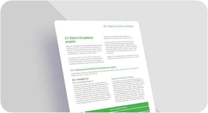 39 Life Is On | Schneider Electric www.se.com 2021 Sustainable Development Report 2.2 Ethics & Compliance program Each year, Schneider Electric’s Enterprise Risk Management team draws up a risks matrix at Group level which is presented to the Executive Committee and used to identify all risks faced by the Company; as part of this wider exercise the Company conducts a risk assessment on ethics and compliance matters. The exposure of the Group to risks of non-compliance and unethical practices has been increasing for several years, due to broader externalities for the Group through its geographic expansion, participation in complex projects, and a large range of acquisitions, all leading to the need to strengthen the effectiveness of its risk-based Ethics & Compliance program. Over the past years, the increase of law enforcement by public authorities, new regulations, and higher reputational risk with media exposure have led to the design of a preventive approach of several risks including corruption, fraud, violation of fundamental human rights (health and safety, discrimination, harassment, and sexual harassment), anti-competitive practices, sanctions, and export control. Adopting a full compliance approach on these topics brings trust to employees, customers, partners, suppliers, and local communities. 2.2.1 Governance of the Ethics & Compliance program Schneider Electric has built a strong governance to lead the Ethics & Compliance program to the best standards, with responsibilities at Board, executive, corporate, and zone levels. 2 . 2 .1.1 E xe c u t i ve l eve l Board Audit & Risk Committee Schneider Electric’s Board of Directors oversees the Ethics & Compliance program through a dedicated annual session of the Audit & Risks Committee during which the program, risks and improvements, and action plans, are reviewed by the Directors. Once a year, the Directors also review the Ethics & Compliance program’s effectiveness and the allocation of resources to the program (human and financial). In addition, the Directors agree on the audit plan which covers several audits related to the Ethics & Compliance program, and the program’s members are notified of their findings and related recommendations once finalized. Group Ethics & Compliance Committee Schneider Electric has also put in place a dedicated governance to lead the Ethics & Compliance program to the best standards. The program is overseen by the Group Executive Committee, through the Group Ethics & Compliance Committee. This Committee is composed of nine permanent members in charge of defining the program’s strategy and priorities: Chairman & CEO; Chief Governance Officer (Committee Chairperson); Chief Human Resources Officer; Chief Strategy & Sustainability Officer; Chief Compliance Officer; Chief Legal Officer; Chief Corporate Citizenship Officer; Group Internal Audit & Control Officer; and Senior Vice-President, Sustainability Development. They ensure that the program is consistent with the Group’s strategic goals. This Committee meets twice a year. Executive Committee Board – Audit & Risk Committee Group Ethics & Compliance Committee Regional Compliance Officers Ethics Delegates Group Operational Compliance Committee (GOCC) Regional, Zone, Cluster and Country Ethics & Compliance Committees Disciplinary Committee Detect and manage non-compliance Define, explain and disseminate priorities Support employees in navigating with our Trust Charter and prevent, detect and manage non-compliance Disciplinary review of non-compliances and levy sanctions Ensure implementation of Compliance program according to risks Executive level Corporate level Zone level Continuous improvement Continuous improvement