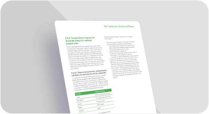 69 Life Is On | Schneider Electric www.se.com 2021 Sustainable Development Report 2.12.2 Communities living around Schneider Electric’s customer projects sites In 2021, Schneider Electric has engaged into a review of risks for local communities residing close to the sites where the Group is implementing projects for customers. These projects can be, for example, the building of an electrical switchgear station to distribute electricity, either to the grid or to private large users (factories, professional buildings, etc.). Depending on the profile of the end-customer, these projects necessitate the on-site coordination of several types of contractors: civil engineering, industrial process experts, electricity specialists, communication infrastructure experts. Relations with local communities, when relevant, are usually handled by the main contractor, or by the end-customer. 2.12.2.1 Characterizing the sites, ranking them by risk level, and selecting the ones for a deep dive To identify the main sites presenting potential risks, Schneider Electric has pre-selected customer projects based on the combination of two criteria: country risk and customer activity. Country risk is a compound of several external publicly available indicators (transparency, human rights, etc.). Customer activity is based on the industrial process specific to the end-customer. For illustration, the top five risks are ranked as follows: Country Customer activity Chad Mining, minerals and metals Mauritania Oil, gas and petrochemicals Angola Power and grid Nigeria Life sciences Tanzania Water Based on these criteria, the Group has established a list of 25 projects to be reviewed with their management team. 2.12.2.2 Evaluating the impact for selected sites Projects reviewed can be grouped into three categories, each reflecting the type of involvement of Schneider Electric, and the mitigation capabilities of Schneider. • Type A: Schneider Electric is providing switchgear and/or industrial equipment, is also the main contractor for the project, and is present on site. Mitigation actions can be decided and implemented by Schneider. • Type B: Schneider Electric is providing switchgear and/or industrial equipment, but it is not the main contractor. Mitigation capabilities are limited. • Type C: Schneider Electric is providing software and control, and is mostly working remotely, being present on site only for final testing and commissioning. Mitigation capabilities are ver y low. Among the projects reviewed, 2 were of type A, 6 of type B, and 6 of type C. • 2 projects of type A: the study of these projects is showing the following risks and benefits on local populations: − Temporary/brief disturbance in the transportation and mobility due to large materials and equipment delivery. − Temporary and planned power outages. − No environmental or pollution risk. − Local security implemented by final customer, with no or little impact on the neighboring communities. − The project is a source of employment for local companies. • 12 projects of type B and C: among these projects, six are projects with significant impact on the local communities (petrochem, etc.) and six have no impact (desert or remote location). For these projects with significant impact, relations with local communities are handled by the end-user or the main contractor. Given the small size of Schneider Electric’s contribution to the overall project investment, the capacity of Schneider to be a significant contributor to the mitigation measures is very limited. Specific policies that would increase this capacity, adapted to these project profiles, are currently studied.