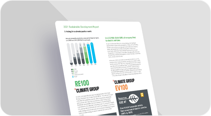 www.se.com Schneider Electric 82 2021 Sustainable Development Report Annual renewable electricity usage percentage by region, and 2025 and 2030 (RE100) Group targets 2017 2018 2019 2020 2021 2025 2030 2% 30% 50% 80% 82% 90% 100% NAM Europe APAC Rest of the World Target In 2020, Schneider Electric was recognized as the 2020 Clean Energy Trailblazer by Climate Group’s RE100. This was the first year of the RE100 Leadership Awards, which recognizes companies going above-and-beyond to accelerate a clean energy future. Schneider was awarded the honor based on its wide-ranging commitments, including the Company’s own CO 2 reduction targets, CO 2 savings delivered by EcoStruxure ™ technologies to customers, clean energy advisory services, and its Access to Energy program, which provides energy access in underserved communities globally. 90% of electricity sourced from renewables Since 2017, the Group has accelerated renewable electricity sourcing and the installation of on-site solar panels, coupled with EcoStruxure ™ metering and power architectures. In 2021, more than 195 sites source 100% renewable electricity and 47 sites are equipped with on-site solar capacities. Climate SSE #3 90% 80% Baseline 2025 target 2021 Progress 80 90 82% 3.4.3 EV100: Shift 100% of company fleet to electric vehicles As part of Schneider Electric’s climate strategy, we investigate opportunities to improve the accessibility of sites, with commuting shuttles, secure bicycle storage, personal lockers and changing areas, and pedestrian-friendly access paths connecting to local routes. Schneider also promotes flexible working to avoid thousands of unnecessary or avoidable trips generating travel-led emissions by enabling employees to connect remotely, to work from home, and at customer sites. At the end of 2019, Schneider accelerated its efforts to cut CO 2 emissions from transport with the commitment to switch to 100% electric cars by 2030. By 2025, Schneider Electric aims to switch one-third of its corporate car fleet. The Group demonstrates this commitment by being a member of EV100, a global initiative bringing together forward-looking companies committed to accelerating the transition to electric vehicles (EVs) and making electric transport the new normal by 2030. At the end of 2021, 7.7% of the Group’s corporate car fleet was comprised of EVs. One-third of corporate vehicle fleet comprised of electric vehicles (100% by 2030) The Group has set an ambition to pace its 2030 ambition of an all-electric fleet. Germany Is leading this transition for Schneider Electric. Their journey started in 2018, with the objective to shift towards 50% electric vehicles by 2021. Their approach was holistic, taking into consideration all variables from infrastructure maturity to fleet and driver profile; today the country has 40% EV (due to delays in the supply chain) and aims to reach 100% by 2023. 33% 1% Baseline 2025 target 2021 Progress 0 120 7.7 % Resources SSE #7 3 Acting for a climate positive world