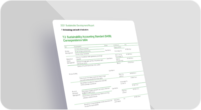 www.se.com Schneider Electric 162 2021 Sustainable Development Report 7 Methodology and audit of indicators 7.3 Sustainability Accounting Standard (SASB) Correspondence table Topic Accounting metric Category Unit of measure Code Response/ Data/ References in the Universal Registration Document 2021 Topic Energy Management (1) Total energy consumed Quantitative Gigajoules (GJ) R T- E E -13 0 a .1 The following KPIs covers our measured energy consumption (about 81% of Group energy consumption): (1) 3,889,318 GJ (1,080,366 MWh) (2) 37.0% (399,564 MWh) (3) 58.3% (629,844 MWh) Energy Management (2) percentage grid electricity Percentage (%) (3) percentage renewable Hazardous Waste Management Amount of hazardous waste generated, percentage recycled Quantitative Metric tons (t), Percentage (%) R T- E E -15 0 a .1 Hazardous waste generated: 8,549 tons. Hazardous waste channeled according to Schneider Electric expectations: 8,549 tons. Hazardous Waste Management Number and aggregate quantity of reportable spills, quantity recovered Number, Kilograms (kg) RT- EE-150a.2 Zero reportable spills in 2021, therefore no recovered quantity to report. Product Safety Number of recalls issued, total units recalled Quantitative Number R T- E E -2 5 0 a .1 14 product recalls have been issued in 2021. Schneider Electric has an Offer Safety Alert (OSA) process to alert the relevant Line of Business and other interested parties as soon as it is suspected that customers’ health or property safety may be put at risk by Schneider products, solutions, or projects. The Offer Safety Alert Committee (OSAC) is a permanent corporate committee that oversees and regulates the management of OSA. Its mission is to ensure all OSA are managed with the due diligence and urgency to minimize safety risks to customers. Its independent, multi-discipline nature allows the OSAC to make decisions in our customers’ best interest. Product Safety Total amount of monetary losses as a result of legal proceedings associated with product safety Reporting currency RT-EE-250a.2 No material loss at the Group level. Product Life cycle Management Percentage of products by revenue that contain IEC 62474 declarable substances Quantitative Percentage (%) by revenue R T- E E - 410 a .1 Around 60 to 70% of our products (by turnover) contain IEC 62474 substances (which covers 37 worldwide regulations and about 160 substance families). With the current information collected from our supply chain, we manage to cover nearly all substances and regulations. Information disclosed for our Green Premium products covers these substances. More details on Green Premium in section 2.4.3 “Green offers” page 156. Product Life cycle Management Percentage of eligible products, by revenue, that meet ENERGY STAR ® criteria RT- EE- 410a.2 This metric is not relevant at global level as it is only applicable in US and Canada. Revenues derived from ENERGY STAR UPS are included in our Impact Revenues measure (see below). Revenue from renewable energy-related and energy efficiency-related products Reporting currency RT-EE-410a.3 Schneider Electric measures “Impact revenues” (previously “Green revenues”), ie revenues coming from offers that bring energy, climate, or resource efficiency to our customers, while not generating any significant harmful impact to the environment. In 2021, 71% of Group revenues qualify as Impact revenues. The Group aims to grow its Impact revenues to 80% by 2025 as part of SSI 2021-2025. Materials Sourcing Description of the management of risks associated with the use of critical materials Discussion and Analysis n/a RT-EE-440a.1 Details regarding our sustainable procurement practices are provided in section 2.2.11 “Sustainable relations with suppliers” page 117, in particular our Vigilance plan, Conflict Minerals and cobalt programs. When the country of origin is known to be in the conflict zone, 100% of the smelters and refiners were verified conformant. Therefore, the Group has no reason to believe that any conflict minerals the Group sourced, have directly or indirectly financed or benefitted armed conflict in the covered countries. The Group is exposed to fluctuations in energy and raw material prices, in particular steel, copper, aluminum, silver, lead, nickel, zinc and plastics. The Group has implemented certain procedures to limit exposure to rising non-ferrous and precious raw material prices. The Purchasing departments of the operating units report their purchasing forecasts to the Corporate Finance and Treasury department. Purchase commitments are hedged using forward contracts, swaps and, to a lesser extent, options. Materials Sourcing Business Ethics Description of policies and practices for prevention of: (1) corruption and bribery and (2) anti-competitive behavior Discussion and Analysis n/a R T- E E - 510 a .1 As stated in its Trust Charter and Anti-Corruption Code of Conduct, Schneider Electric is committed to comply with all applicable laws and regulations, such as the OECD’s Convention on Combating Bribery of Foreign Public Officials in International Business Transactions, the US Foreign Corrupt Practices Act (FCPA), the UK Bribery Act, and the French Sapin II law. Schneider Electric applies a zero-tolerance policy towards corruption and other unethical business practices and considers that “doing things right” is a key value-creation driver for all its stakeholders. We count on our employees and third parties to promote business integrity. A thorough description of our policies and practices is provided in sections ‘Prohibit any Form of Corruption” and “Require Third-Party Integrity” of the Trust Charter. Business Ethics Total amount of monetary losses as a result of legal proceedings associated with bribery or corruption Quantitative Reporting currency RT- EE- 510a. 2 No material losses. Total amount of monetary losses as a result of legal proceedings associated with anticompetitive behavior regu