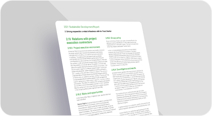 www.se.com Schneider Electric 60 2021 Sustainable Development Report 2 Driving responsible conduct of business with the Trust Charter 2.10 Relations with project execution contractors 2.10.1 Project execution environment Schneider Electric’s products and solutions are usually combined into larger systems such as electricity distribution and energy management in a building, or production process automation in a factory. The build-up of such systems can be complex and typically involves several different parties before they are commissioned by end customers. For Schneider Electric, there are two options: to sell components through channel partners who take the responsibility to build and deliver the system; or to build and deliver the system directly for the end customer, as a project. This second option requires coordinating several project contractors (panel manufacturers, system integrators, building contractors, etc.), usually on the premises of the end customer. The common characteristics of these projects are that they happen primarily off-site (mostly on customer premises, existing or future), and they involve several different parties, global or local, bringing their specific added value. Each project is specific, in its size, duration, and location. Therefore, the relations with contractors are specific to a contract, and not necessarily recurrent. In 2021, Schneider Electric worked with more than 9,900 active solution suppliers in the Group’s portfolio (with a spend of over €1B). 2.10.2 Risks and opportunities In the frame of the “Duty of Vigilance” plan, specific risks have been identified. Human Rights: as project sites are located in countries where Schneider may not be present, and involve independent subcontractors, there is a risk that the Schneider Electric- recommended policies in terms of health and safety, as well as decent workplace, may not be properly implemented. The main risks are physical accidents and injuries, or the improper treatment of employees (wages and salaries, resting time), especially temporary and/or foreign employees. Business Ethics: Projects that are conducted in countries where business ethics standards are insufficient may be subject to specific risks such as corruption, bribery, or pressures of a similar nature. Cybersecurity: Some subcontractors may have digital interactions with the end customer and Schneider at the same time. Therefore, their level of cybersecurity and data protection may create some risks for the project and the final customer. A solid management of Schneider Electric’s subcontractors allows to reduce the risks of incidents or accidents on site, and therefore protects workers, the communities living around the project site, and the final customer’s employees and assets. 2.10.3 Group policy As part of its Duty of Vigilance program, Schneider Electric has deployed a policy of identification of risky subcontractors and implemented an on-site audit program. The results are described in the “Due diligence and results” section below. In 2021, to further anticipate and reinforce its risk mitigation measures, the Group introduced an evolution of its project decision-making process. The aim is to include a risk assessment of human rights and environmental impacts at all key milestones of the process, and to select the mitigation measures that will allow to reduce these risks. During the execution of the project, a regular review of the efficiency and effectiveness of these measures will be conducted. This process evolution will be effectively applied to project reviews from early 2022. 2.10.4 Due diligence and results Schneider Electric operates with a pool of project contractors (or “solution suppliers”) from more than 9,900 companies. Not all of them may be active during a year. In the course of its supplier risk mapping exercise, Schneider Electric has identified approximately 200+ solution suppliers categorized as “high risk”. Since 2018, 62 suppliers have already been audited, slightly below the ambition due to 2021 slow down as a consequence of COVID-19. The 13 audits on solution suppliers performed in 2021 have allowed Schneider to raise 157 non-conformities. Out of these non- conformances, 11 are assessed as “top priority”. The most recurring non-conformities with high risk solution contractors are: need of adequate and effective fire emergency evacuation and response drills, improvement of on-site security measures to protect workers (safety hazards, permit and testing reports for occupational injury and illness), identify correctly effective emergency. In addition to these non-conformities, specific risks related to local contract negotiation and relations with local authorities may occur. Actions following non-conformities are the same as with other suppliers (re-audits, trainings, workshops). Specific measures are implemented for this project environment: Schneider Electric implements regular reviews of safety incidents on customers’ sites, involving the Global Safety team and the Project Management leadership. The Group also reinforced training on Anti-Corruption and Business Agent policies for its employees involved in commercial negotiations. The project follow-up with contractors and the selection processes for contractors has been adapted to ensure vigilance topics are considered early in the project stage.