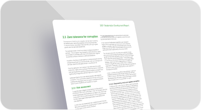 45 Life Is On | Schneider Electric 2021 Sustainable Development Report 2.3 Zero toler ance for corruption The exposure of the Group to corruption risk has been increasing for several years, due to the expansion of the Group’s activities in new economies, especially in Asia and Africa, through organic growth, a nd mer gers a nd ac quisitions. The business model of the Group relies on a large ecosyst em of partners. This ecosystem may represent a risk for the Group, being accountable for ac tivities p erformed o n its b ehalf, a nd i n regards to potential conflicts of interest or unethical solicitations. In addition, the Group is participating in complex projects involving a large range of partners in sectors at risk, such as oil and gas, and with end-users from the public sector in countries at risk. Over the past years, the increase of law enforcement by public authorities, higher press coverage of fines imposed on companies, and new regulations requiring a strong compliance program have significantly changed the potential impact of corruption risks. Schneider E lectric ha s a z ero t olerance p oli cy w ith regard t o corruption. This commitment materialized through a strong and continuously de veloping A nti-Corruption C ompliance pr ogram, which is part of the Ethics & Compliance program. 2.3 .1 Risk assessment To meet the legal obligations specified by the December 9, 2016 French law known as the Sapin II law, the Company launched a risk mapping exercise focusing on corruption risks, which was conducted in 2018 at global level and in 2019 at regional levels. In 2020, ac tion pl ans w ere i mplemented i n ac cordance w ith risks iden tified. In 2021, this risk assessment was updat ed as part of the new Ethics & Compliance risk mapping, which focuses in particular on Corruption and Conflicts of Interest. 2.3.2 Risk management 2.3.2.1 Anti-Co rruption frame work As stated in our Trust Charter and Anti-Corru ption Policy, S chneider Electric is committed to comply with all appl icable laws and regulations, such as the OECD’s Convention on Com ba ting B ribery of Foreign Public Offici als in International Bus iness Transactions, the US Foreign Corrupt Practices Act (FCPA), the UK Bribery Act, and the French Sapin II law. Schneider E lectric a p plies a z ero-tolerance p olicy t owards corruption a nd o ther u nethical b usiness pr actices a nd c onsiders that “doing things right” is a key value-creation driver for all its stakeholders. We count on our employees and third parties to promote business integrity. For doing so, we must provide them with the tools to encourage them to act right. In order to meet the requirements of the French Sapin II law, the Group released an Anti-Corruption Policy. The Policy was reviewed in November 2019 to take into account results of the corruption r isk map ping a nd t o pr ovide em ployees w ith e xamples illustrating situations they may face. The Anti-Corruption Policy shall serve as a handbook that anyone may consult when having doubts about appropriate business practices. It is not int ended to address eve ry i ssue o ne m ay en co unter, b ut it pr ovides approp riate examples of corruption risks and offers guidance to resolve many e thical d ilemmas. www.se.com The Gifts & Hospitality Policy p rovides guidance to employees on the ethical handling of gifts and hospitality received and given b y S c hneider E l ectric em ployees. A new version of the Business Agent Policy was released in August 2019 to meet legal requirements and public authorities’ g uidance, especially regarding risk-based approach of the due d iligence, a s w el l a s internal r ecommendations f ollowing se veral audits p erformed o n applicability o f t he p olicy i n 2018. The risks associated with onboarding new acquisition targets a re n umerous a nd c onsequently, M erger a n d A cquisition ( M &A) guidelines ha ve b e en p ublished t o iden tify, m anage, a n d m itigate those risks at the earliest stage possible. These guidelines aim to cover the very first steps of identifying potential targets (M&A strategy), what to look out for in data-rooms, and finally how w e plan to integrate the acquired entity into our compliance o rganization. T hese s ame r u les a lso a pply w hen S c hneider E l ectric decides to make a divestiture with a step-by-step approach to m anaging t he t r ansition. In 2021, a Conflict of Interest Policy was published, in particular c reating a procedure to disclose and manage any identified c onflict of interest. A Donations Policy has also been published a nd i mplemented, w hich a ims, a mong o t her t hings, t o manage r isks of unlawful use of money and then corruption. 2 .3.2.2 Empowering e mployees a gainst c orruption In 2020 and 2021, a set of anti-corruption e-learnings was built, p roviding guidance on real life risk scenarios; it was designed t aking into account the trainees’ needs and expectations, and i s mandatory for targeted employees exposed to corruption risks through their job codes, i.e. those identified as such by t he corruption risk mapping. This led to a curriculum of modules o f e-learnings, deployed in 2020: a general module on the “zero t olerance” message against corruption and an explanation of the l egal framework and risks, and two specific modules about third parties and gifts and invitations. In 2021, four additional modules w ere created about facilitation payments, conflict of interest, c onditions that make people commit the wrongdoing, and how to r aise c oncerns i n S c hneider E lectric. T he m odules w ere s upported by top leaders’ videos demonstrating the “tone at the top” on this c rucial matter and are available in 14 languages. In 2021, the set o f anti-corruption e-learnings has been assigned to more than 40,000 employees and 97% completed it. 2 .3.3 Focus o n re s ponsible lob bying, political a ctivity, a nd d onations I n its Trust Charter, Schneider Electric takes a clear stanc