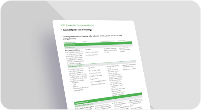 www.se.com Schneider Electric 26 2021 Sustainable Development Report Following its assessment of material risks, Schneider Electric presents its main ESG risks and opportunities. Risk description and impact Policies Main actions and 2021 performance Opportunity created Business conduct Competition law Non-competitive behavior Schneider Electric products are sold worldwide and are subject to national and supranational competition laws and antitrust regulations. Non-compliance could result in fines and impact the company’s reputation. Trust Charter Conflict of interest Policy Competition Law Policy • New whistleblowing system in place this year called the Trust Line Increase relationship with suppliers to ensure compliance. Corruption and bribery Corruption is the abuse of entrusted power for private gain. It may occur through third parties’ activities (partners, suppliers, agents, companies to be acquired) and cause various impacts for the company: • Reputational • Legal • Financial • Development of the company • Employer brand Trust Charter Anti-Corruption Policy Business Agents Policy Gifts & Hospitality Policy Donations Policy Conflict of Interest Policy (new) Business Agent Policy (new) • Trust Line whistleblowing system • Specific risk mapping dedicated to “Ethics & Compliance” risks • SSI #7: Measure the level of confidence of our employees to report unethical conduct: 81% achieved, aiming for 10pts increase by 2025 • Four additional modules as part our anti-corruption e-learning • SSE #13: 100% of employees trained every year on Cybersecurity and Ethics in 2025 (96% achieved 2021) More opportunities with actual and potential customers Talent attraction and retention Corporate governance Delivering on ESG performance Failure to achieve our long-term sustainability commitments • Brand and reputational impact • Distrust from stakeholders Internal Governance in place at every level (Board, Executive Committee, Operations) to drive and monitor progress Quarterly Schneider Sustainability Impact (SSI) public disclosure SSI performance embedded in managers’ and leaders’ short-term incentives • SSI 2021 performance reached 3.92/10, beyond 3.75/10 target • Top 1% of several ESG Ratings Worldwide confirming we are headed in the right direction Higher credibility and trust to support our customers in their Climate and Sustainability journey Risks mitigation ahead of competition thanks to the SSI disruptive and virtuous continuous improvement process ESG compliance Failure to report, lack of transparency New Corporate Social Responsibility regulations, Standards and market expectations are redefining what “Sustainable businesses” are • Brand and reputational impact • Risk of exclusion from growing Socially Responsible Investment (SRI), ESG or green portfolios Transparent public reporting on sustainability objectives and performance in quarterly SSI reports and in annual reports aligned with key frameworks (GRI, SASB, TCFD, WEF Common Metrics, SDGs) Regular engagement with stakeholders to identify critical sustainability topics (materiality analysis) Engagement and dialog with investors to ensure expectations are met • Upgraded quarterly SSI reports • Winner of the 2021 Transparency Awards for ESG information Greater attractivity to investors, customers and talents Strengthened partnerships with clients, suppliers, and other partners in the Group’s ecosystem Anticipation of sustainability trends and risk mitigation Influence other companies to have better practices 1 Sustainability at the heart of our strategy