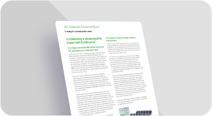 www.se.com Schneider Electric 78 2021 Sustainable Development Report 3 Acting for a climate positive world 3.3 Delivering a climate positive impact with EcoStruxure ™ 3.3.1 Save and avoid 800 million tonnes of CO 2 emissions on customers’ end With EcoStruxure ™ , the IoT-enabled architecture, Schneider Electric helps companies become more efficient and reduce their CO 2 emissions. To demonstrate this positive impact, a new indicator was launched in 2018 to quantify CO 2 savings delivered to customers using Schneider’s offers. New technologies were added to expand the methodology coverage in 2021: SF 6 recovery services, SF 6 AirSet solutions, Field Services, Energy Management Systems (EMS for electrical network) and data center design. Overall, from 2018 to 2021, Schneider Electric helped customers save and avoid 347 million tonnes of CO 2 e. From 2021 onwards, Schneider is committed to extend the methodology to progressively include all relevant offers, to report both saved and avoided CO 2 emissions with customers and partners, and to help customers save and avoid 800 million tonnes of CO 2 by 2025, cumulatively since 2018 (SSI #2). This commitment is one of the three performance indicators of the first ever convertible Sustainability-Linked Bond launched by the Group at the end of 2020. The innovative CO 2 accounting methodology to quantify CO 2 savings delivered to customers, created by Schneider, allows for the quantification of CO 2 induced and saved by the Group’s solutions at its customers’ premises. Detailed calculation rules are defined per offer, leveraging sales data, market expertise, and technical knowledge. The methodology is designed to become a shared industry standard, its principles are applicable across the capital goods and consumer durables sectors. Attention was given to define rigorous calculations, with conservative assumptions. The methodology is public and was developed with Carbone 4, an expert CO 2 accounting consulting company. Saved emissions are net emissions (savings are netted from use-phase induced emissions) and consider savings delivered on brownfield (retrofit) projects. Avoided emissions are defined with respect to greenfield sales (new infrastructures); they are defined as a limitation of emissions increase versus a reference scenario. Avoided emissions are net emissions. They represent the difference between emissions of a reference scenario and emissions with the implementation of Schneider Electric’s offer. Schneider’s methodology, “Saved and avoided CO 2 : decarbonization creates value” is available for download on se.com; as well as the detailed methodology (and hypothesis) for all Schneider’s solutions 3.3.2 Deliver access to energy products and solutions Today, 25% of the world’s population still has no or reduced access to energy, and only 17% of the total global energy consumption was renewable in 2017. Schneider Electric’s products and solutions aim to address this “energy paradox”, balancing the need to reduce the planet’s carbon footprint while ensuring the inalienable human right to quality energy and digital access. In line with its carbon pledge towards net-zero CO 2 emissions, Schneider has committed to provide access to green electricity to 100 million people in underserved areas by 2030, both as a fundamental right and a means for social and economic development. Schneider’s Access to Energy program bridges the energy gap by focusing on offerings and business models for village electrification and domestic energy needs, as well as investing in and supporting companies providing affordable, clean, and renewable energy. Products and solutions address individual and collective needs across the energy chain, from solar lanterns and solar home systems to decentralized small power plants, water pumping systems, and street lighting. A great example of Schneider’s products is the portable Mobiya solar powered lamp providing individual lighting and mobile charge for 48 hours. In emerging markets, this type of device helps extend the number of hours of activities and livelihoods, but also limits the use of kerosene lamps that have a significant environmental impact. Villaya is another great example of decarbonized energy solutions available for businesses and communities to ensure electrification in remote sites, either 100% solar or hybrid. All of these social impact products and solutions complement the Group’s offerings for its customers to be the digital partner for sustainability and efficiency.