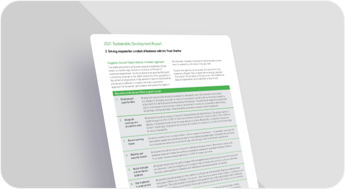 www.se.com Schneider Electric 66 2021 Sustainable Development Report 2 Driving responsible conduct of business with the Trust Charter Suppliers Decent Work initiative: A holistic approach The extent and severity of the crisis requires a systematic, broad based, ecosystem approach and not simple rectification of observed malpractices. The focus needs to be opening dialog and normalizing universal worker rights irrespective of the geography or the context of employment. A key element in this is to institutionalize policies and additional processes that adopt a preventive approach for the worker rights violation and protect the dignity of the individual. Gradually, such actions need to become the new norm for evaluating performance of supply chain. Towards this objective, as a first step, Schneider Electric will implement a Decent Work program with its strategic suppliers. The program will be based on the key tenets of the International Labour Organization’s (ILO’s) definition of decent work. Key pillars of the Decent Work program include: 1. Employment opportunities Employment opportunities should be available in a transparent, well-informed manner, and without any charges to all eligible, as a right. In case of any expense incurred by the worker towards obtaining employment, the same should be reimbursed by the employer. The work should respect and uphold the dignity of employees and proactively create an environment to resolve and remediate modern slavery, forced labor, and bonded labor. There should be a process to ensure no child is employed. 2. Adequate earnings and productive work Employment should be a source of economic independence and dignified living. The gradual decline of industrial wages and the COVID-19 crisis have severely impacted the economic outlook of the workforce, globally. Companies should review the wage policies to ensure affordability of a dignified living by the workers. Additionally, employment should equip the workforce to improve current skill set and knowledge for future employability. 3. Decent working hours Excessive working hours is a legal violation, often accepted as “necessary”. It is generally connected with low industrial wages and used as an excuse to not provide appropriate wages. Companies should review and remediate excessive hours and should align with the legal and/or international requirements. 4. Stability and security of work Employment should be a source of economic stability and peace of mind. Uncertainty of job security increases stress and makes the workforce vulnerable to abuse and hazardous working conditions. The problem has been exacerbated due to COVID-19-related job losses. 5. Social dialogue and workplace relations Employees should have the right to engage with management and collectively put across their concerns and demands. Collective bargaining encourages workers to timely raise concerns, acts as a barometer and early warning system to assess worker satisfaction and reduces worker vulnerability. 6. Fair treatment in employment Employment should be based on merit, ability to do the job, and fair treatment should be extended to all employees. Differences in lifestyle, choices, etc., often become a source of discrimination, victimization, and harassment. This curbs freedom of expression, hiding preferences, and creates mental health challenges. Companies should ensure a workplace that accepts diversity and provides an inclusive work environment. 7. Safe work Employment should result in economic independence and augment the ability to exercise a healthy and prosperous life. It should not result in ill-health, risk to well-being, or be a source of injury/misery. 8. Social protection Industrial wages are often not sufficient to meet the adequate living standards. The problem is exacerbated in cases of health emergencies. Social protection, provided by employers/governments, provide a much- needed safety net from economic shock, descent into poverty, and vulnerability. Companies should ensure that all employees have access to the social security safety net. 9. Purchasing practices Purchasing practices and requirements significantly impact working conditions. They influence the working culture of the supplier organization to meet customer requirements. The power of procurement can be a strong driver for positive change to include decent work conditions as a pre-requisite among the supply chain partners, when balanced with other commercial criteria. 10. Balancing work and family life Family responsibilities disproportionately impact genders and result in unequal participation in economic activities. Workplaces should strive to create a level playing field and provide all possible opportunities to employees to participate in economic activities without compromising the family responsibilities, which may require periods away from work (e.g., maternity, family care, flexible hours, adequate child care). Work environment should act as a leveller/equalizer and not augment the disparity.