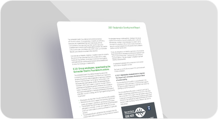 143 Life Is On | Schneider Electric www.se.com 2021 Sustainable Development Report The Schneider Electric Foundation works almost exclusively with local structures. It is a guarantee of reliability and efficiency because only organizations that work most closely with the communities to be supported know their specific needs and constraints and can provide the appropriate solutions. The creation of the zone/cluster committees, since 2019, made up of Schneider Electric zone directors is a step in that direction. Over and above financial, material, or logistics support for projects, the actions of the Schneider Electric Foundation aim to create bonds among partners, encourage structures to work together, and build relevant and innovative solutions with all stakeholders to raise the challenges of sustainability. 6.3.8 Group employees, spearheading the Schneider Electric Foundation’s actions The Schneider Electric Foundation strongly focuses on the involvement of Group employees in all the actions it implements. Whether they are Foundation delegates or employee volunteers, they are the link between the Company, the Foundation, and the supported organizations. In 2012, the Schneider Electric VolunteerIn NGO was created to organize volunteer missions benefiting the Foundation’s partners. Wherever the Company is based, Schneider Electric VolunteerIn empowers people to be actors and ambassadors of societal commitments in the fields of education, access to energy, and the fight against energy poverty. In particular: • Employees volunteer their time and make their skills available; • Partners look for skills to support their activities, specify their needs, and support volunteers in carrying out their mission; • The Schneider VolunteerIn association as well as the Foundation delegates co-ordinate, connect, and organize the process and cover costs related to carrying out missions, in particular abroad; • The Schneider Electric entities host the volunteers when the mission takes place outside their country of habitual residence. 6.3.8.1 Governance The Schneider Electric VolunteerIn Executive Board is composed of Schneider Electric leaders: • Charise Le (Chairman, Chief Human Resources Officer); • Michel Crochon (Vice-President), • François Milioni (Secretary, in charge of the Training & Entrepreneurship program); • Christophe Poline (Treasurer, in charge of the SEEA solidarity investment fund); • Emir Boumediene (Member, volunteer representative); • Gilles Vermot Desroches (Member, Senior Vice-President Corporate Citizenship). One to two Executive Board meetings are organized each year. 6.3.8.2 100 delegates in 80 countries to catalyze the Schneider Electric Foundation’s actions The Schneider Electric Foundation draws on a network of around 100 volunteer employees, also known as delegates, covering 80 countries. Their role is to select local partners in the fields of vocational training in the energy sector, entrepreneurship, and raising sustainability awareness. They inform the employees of their entity, as well as the Foundation. They follow the progress of the projects after they have been launched. Each proposed project is subject to a review process based on administrative and financial data by the Schneider Electric Foundation and by Fondation de France before funds are released. The delegates manage a digital platform, VolunteerIn, that groups together all the missions proposed by the Foundation locally and internationally. Available in eight languages, the platform can be accessed from anywhere in the world and enables employees to apply for volunteer assignments for the benefit of the Foundation’s partners and their beneficiaries. Finally, the delegates co-ordinate the organization of the Schneider Electric Foundation’s campaigns for international mobilization such as the Tomorrow Rising fund. This showcases local initiatives to a global audience. They also engage in campaigns organized following natural disasters. An assignment campaign will be conducted in 2022 to renew the Foundation delegates’ mandates. Each year, around 35,000 employees in 50 countries take part in these campaigns. 6.3.8.3 Standardize measurement to improve the impact and coherence of actions in favor of sustainability The Schneider Electric Foundation is a groundbreaker in the measurement of the social impact of the actions that it supports. The idea is to enable its partners to better fulfill their missions by identifying areas for improvement. The Schneider Electric Foundation is assisted in particular by KiMSO, a social impact assessment consulting firm. A first study was conducted in 2018, as part of the fight against energy poverty, to draw up an innovative methodology to assess the social impact of missions. This methodology is placed at the disposal of project sponsors. CLER, the Energy Transition Network, has used this methodology. 50,000 volunteering days since 2017 In 2021, employee participation in the activities of the Schneider Electric Foundation greatly increased. The pandemic raised a lot of fragilities in our society. In this difficult period, volunteers at Schneider Electric have accelerated their contribution to initiatives aiming at access to food, education and health. Mainly through digital and remote missions, they demonstrated their ability to adapt and to help the most vulnerable; above all the youth in need of support and coaching. With more than 25,000 volunteering days in 2021, over 50% of the 2025 target for this indicator has already been reached. Generations SSE #25 50,000 18,469 Baseline 2025 target 2021 Progress 0 100 27,981