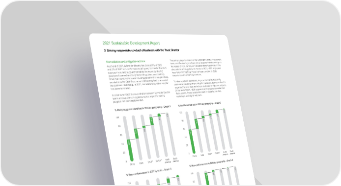 www.se.com Schneider Electric 64 2021 Sustainable Development Report 2 Driving responsible conduct of business with the Trust Charter Remediation and mitigation actions As of end of 2021, Schneider Electric has closed 97% of 2020 and 3% of 2021 non-conformances (all types). Schneider Electric’s approach is to help suppliers remediate the issues by sharing good practices and providing them with guidance and training. When non-conformances are not remediated (mainly top priorities), escalation to the Chief Procurement Officer may lead to an end of the business relationship. In 2021, one relationship with a supplier has been terminated. In order to reinforce the co-ordination between Schneider Electric teams and suppliers on vigilance topics, a specific training program has been implemented. The primary target audience is the Schneider Electric Procurement team, and the training modules aim to increase their knowledge on the nature of risks, so they can integrate these topics early in the discussions with suppliers. At the end of 2021, ~580 employees have taken this training. These trainings combine in-class experience with e-learning sessions. To raise suppliers’ awareness, improve their ability to identify risks earlier, and implement mitigation solutions, Schneider Electric organized face-to-face workshops dedicated to vigilance subjects. At the end of 2021, ~500 supplier team members have attended these events. These sessions include in-class face-to-face workshops and digital webinars. 56% 39% 4% 0% 1% 0% 0 20 40 60 80 100 EAJP* EMEA** North America South America India China 36% 29% 20% 13% 10% 5% 0 20 40 60 80 100 Management Environment Ethics Labor Health & Safety 46% 23% 5% 18% 7% 1% 0 20 40 60 80 100 EAJP* EMEA** North America South America India China 55% 24% 6% 4% 8% 3% 0 20 40 60 80 100 EAJP* EMEA** North America South America India China % Risky suppliers identified in 2021 by geography – Graph 1 % Audits carried out in 2021 by geography – Graph 2 % Non-conformances in 2021 by topic – Graph 3 % Non-conformances in 2021 by geography – Graph 4 * EAJP: East Asia Japan Pacific ** EMEA: Europe Middle East Africa Impact From the beginning of the program in 2017 to the end of 2021, 579 suppliers have been audited on site, and 7,000+ non- conformances were raised, and subsequently remediated. 37% were related to health and safety issues, and 25% were related to labor issues. Among the most serious ones are issues of fire safety, protection of workers from accidents and injuries, respect of a decent working time including proper resting periods and payment of overtime. Overall, the resolution of these non-conformities has allowed to improve the working conditions for the employees of these suppliers. Although this is a rough estimate, we estimate that 185,000 employees have seen their working conditions positively impacted by the Supplier Vigilance program.