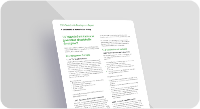 www.se.com Schneider Electric 16 2021 Sustainable Development Report 1 Sustainability at the heart of our strategy 1.4 Integrated and transverse governance of sustainable development At Schneider Electric, sustainability is integrated in the processes and bodies that design and execute the Group’s strategy at Board, executive, and operational levels. 1.4.1 Management Oversight 1.4.1.1 The Board of Directors In 2013, the Board of Directors decided to extend the powers of the Governance & Remunerations Committee to corporate social responsibility (CSR) issues. Since 2014, there has been a specific committee for CSR, the Human Resources & CSR Committee. The Committee meets at the initiative of its Chairperson or at the request of the Chairman & CEO. The agenda is drawn up by the Chairperson. The Committee shall meet at least three times a year (five meetings in 2021). The Committee may seek advice from any person it feels will help it with its work. Main responsibilities: • Employee shareholding schemes and share allocation plans; • Compensation of Group managers; • Succession plan for key Group Executives; • Human resources; • CSR policy and results. In 2021, the Human Resources & CSR Committee reviewed the Sustainability strategy. 1.4.1.2 The Group Sustainability Committee Since 2010, the three members of the Executive Committee in charge of Human Resources, Global Supply Chain, and Strategy & Sustainability have met twice per year with the Sustainability SVP to monitor and steer the Group’s action plans in this area. In 2016, the Global Marketing EVP, joined this Committee. In 2020, the Chief Governance Officer as well as the Chief Financial Officer also joined. The committee meets quarterly. In 2021, this committee met three times. The Committee may seek advice from any person it feels will help it with its work. Main responsibilities: • Decides the sustainability dynamic; • Validates the Schneider Sustainability Impact; • Monitors global sustainability performance and rankings; • Reviews alignment with United Nations Sustainable Development Goals; • Informs the Board Human Resources & CSR Committee. 1.4.1.3 The Stakeholder Committee In order to reinforce its sustainability governance further with solid external insights, Schneider Electric has created a new Stakeholder Committee in 2021. The Committee is composed of 8 external members, sharing the same passion for sustainability, and its mission is to oversee the delivery of long and short-term commitments undertaken by Schneider Electric in accordance with its Purpose and Sustainability strategy. The company strives at ensuring diversity of the Stakeholder Committee members, in terms of ethnicity, gender and experience. The Stakeholder Committee meets three times a year and is chaired by Jean-Pascal Tricoire, Chairman & CEO of Schneider Electric, and Olivier Blum, the Chief Strategy & Sustainability Officer of Schneider Electric, acts as its secretary. 1.4.2 Coordination and monitoring 1.4.2.1 The Group Sustainability department The Sustainability department, created in 2002, has been part of the Strategy department since 2008. It has the following responsibilities: • Schneider Electric’s sustainability strategy and rollout of action plans at Group level with relevant entities; • Schneider Electric’s innovative community projects to ensure continued improvements in the Group’s performance in this area; • Central point of contact for internal and external stakeholders regarding sustainability at Schneider Electric. It is organized around four areas: • Corporate Citizenship, specifically with the Schneider Electric Foundation as well as local economic and social development programs; • Access to energy, with responsibility for the Access to Energy program; • Environment, with responsibility for deploying Group climate and environmental policies, actions and strategies • Group performance, in particular by steering the Schneider Sustainability Impact, the Extra-Financial Performance Declaration, the Schneider Sustainability Report, and the integrated report. 1.4.2.2 Territory Sustainability Leaders In 2021 Schneider Electric took a commitment to empower local communities and asked its Country and Zone Presidents to take three local commitments that impact their communities under the 6 long-term commitments of the Group and adapted to the specific context in their countries, which resulted in 200 commitments taken worldwide. To manage these programs and to better answer the needs of Schneider’s local stakeholders, a new model for sustainability governance in the company was created with a network of 40 Territory Sustainability Leaders. This new network will meet every two months and will work to further instill a culture of sustainability at every level of the company, to empower every employee to act, and to innovate with disruptive sustainability actions. A Group Sustainable Communities Taskforce, chaired by the Executive Vice-President International Operations, and composed of representatives of each of Schneider’s five operational regions and the Sustainability department, has met twice in 2021 to monitor the deployment of the local programs and the creation of the Territory Leaders network. The Taskforce will meet annually going forward to review progress and opportunity for global deployment of local initiatives.