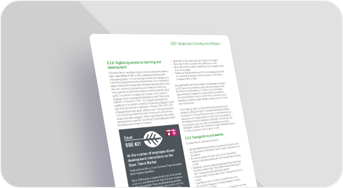 125 Life Is On | Schneider Electric www.se.com 2021 Sustainable Development Report 5.3.8 Digitizing access to learning and development Schneider Electric launched a global career development platform, Open Talent Market (OTM), in 2020, available to all white collar employees globally. The tool leverages AI (Artificial Intelligence) to match the supply and demand of internal talent with a transparent, digital, and borderless approach, empowering employees to drive their own careers by discovering opportunities for mentoring, new positions, and part-time projects, as well as potential career paths. The ambition for usage is to increase 3x the number of employee-driven development interactions in the OTM by 2025 (SSE #21). At the end of 2021, 71% of eligible employees are registered on the platform and 25% of those have engaged in some type of opportunity since registration. Through OTM in 2021, 553 employees have been given visibility to over 1,100 open positions, 3,229 mentoring relationships were formed and 3,248 part-time project roles were assigned. OTM’s Career Planning functionality was launched in June 2021 and almost 20,000 employees visited the feature before the end of the year. 4x the number of employee-driven development interactions on the Open Talent Market Testimonial from Randy Kesel, Customer Project Specialist, North America Operations. ‘Since OTM opened a couple of years ago, it has steadily grown as a user-friendly tool to help Schneider employees realize their potential. There are abundant opportunities for anyone that wants to take their career to the next level, whether that is participating in a project, finding a new position, or taking on a mentoring role. I really think the new Career Planning feature will be a game changer for anyone that wants to map out future role suggestions and how to get there. I’ve frequently used OTM to find new projects, such as the NAM OTM Champions Community, and to stay informed of open positions within the company.’ Equal SSE #21 x4 5,019 Baseline 2025 target 2021 Progress 0 100 x2.1 Schneider Electric also has an open learning ecosystem comprised of interconnected platforms at the center of which is My LearningLink (MLL). This platform integrates e-learning, webinars, social learning, classroom learning, assessments, and full certification paths. The Group continues to see an increase in usage and an increase in digital learning. In 2021 there were: • More than 147,000 employees with access to the system; • More than 74,000 employees visiting MLL every month; • More than 24,000 modules of learning content available in more than one language; • Digital learning consumption at 73% for all employees and 79% for connected employees, stable compared to 2020 and an increase of 45% on 2019. My LearningLink was made available to all employees on mobile in 2021 (as well as on desktop) and is also now integrated with MS Teams to enable learning in the flow of work. Schneider also continues the program to connect shop floor workers to the Schneider Electric network, either from a computer or kiosk installed in our facilities called “Digital Learning Corner” or from their mobile phone. Online training content to Schneider Electric’s partners is also delivered via My LearningLink. The mySchneider Partner Portal is deployed in 140 countries and provides a customized learning experience with targeted training content that is most relevant to the different personas in partners’ businesses. The training portal is accessible to over one million Schneider Electric partners, distributors, resellers, and customers who have completed close to 1.4 million courses since its inception in 2015. 5.3.9 Recognitions and awards Schneider Electric achievements include: • Brandon Hall Excellence Awards in Learning Gold and Silver for the “Leadership for Profitable Growth” program dedicated to our top leaders. • Fortune recognized Schneider as one of the “World’s Most Admired Companies”, ranking #3 within the Electronics Industry in 2021. • Universum, university student specialized ranking, recognized Schneider as #24 in their “World’s Most Attractive Employers 2021” ranking amongst engineering students. • Fortune ranked Schneider #40 on their “Change the World” list in 2021. • Great Place to Work certified Schneider Electric in the US, Colombia, Singapore, Indonesia, Malaysia, Thailand, Philippines, and Vietnam. • Schneider Electric Chairman & CEO, Jean-Pascal Tricoire, was named as “Glassdoor Top CEOs 2021” ranking #2 in France and #8 in Canada. • Schneider’s Glassdoor rating is on a steady growth, up to 4.2 at the end of 2021, recognizing Schneider Electric France as one of the Best Place to Work for 2021: − In 2016, Schneider’s rating was at 3.5 and increased to 3.7 and 4.0 in subsequent years, leading to 4.2 at the end of 2021, out of a 5 points scale. The Glassdoor average is a 3.67. − Contributing to the overall Glassdoor rating, Schneider is rated as 4.3 in Culture & Values, 4 in Work/Life Balance, 3.9 in Compensation & Benefits, and 4.4 in Diversity & Inclusion.