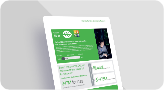 79 Life Is On | Schneider Electric www.se.com 2021 Sustainable Development Report Apps, analytics and services Edge control Connected products Leverage IOT data to identify additional energy efficiency opportunities, increase the lifetime of assets, optimize maintenance services and boost demand flexibility . Manage on-site operations, with day-to-day optimization of energy consumption through remote access and advanced automation . Connected products are eco- designed to improve their efficiency and deliver electricity savings. CO 2 savings in the ecosystem Example: power purchase agreements (PPAs) CO 2 savings in infrastructure (building or industrial process) Example: Building Management System (BMS) CO 2 savings at product level Example: high efficiency UPS Uninterruptable Power Supply and Transformers Deliver 800 million tonnes of saved and avoided CO 2 emissions to our customers CO 2 savings are delivered at every layer of EcoStruxure ™ . For instance, Building Management Systems (BMS) monitor, control, and optimize the performance of buildings throughout their lifecycle. This drives occupancy productivity as well as energy savings. From 2018 to 2021, Schneider Electric’s BMS sales enabled customers to save 11 million tonnes of CO 2 e. Climate SSI #2 800M 263M Baseline 2025 target 2021 Progress 347M Saved and avoided CO 2 are delivered at every layer of EcoStruxure ™ Together with Customers and Partners: 347M tonnes cumulated CO 2 saved and avoided from 2018 to 2021 416M 43M Annual savings are equivalent to: hectares of US forest people in the EU
