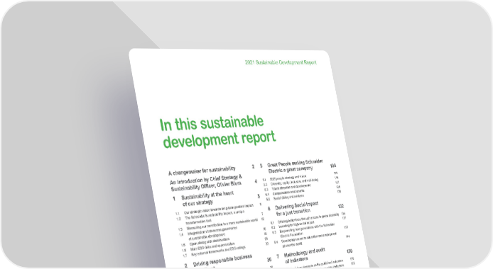 1 Life Is On | Schneider Electric www.se.com 2021 Sustainable Development Report In this sustainable development report A changemaker for sustainability 2 A n introduction by Chief Strategy & Sustainability Officer, Olivier Blum 4 1 S ustainability at the heart of our strategy 5 1.1 O ur strategic vision towards long-term positive impact 6 1 .2 T he Schneider Sustainability Impact, a unique transformation tool 7 1 .3 M easuring our contribution to a more sustainable world 1 2 1.4 I ntegrated and transverse governance of sustainable development 1 6 1.5 O pen dialog with stakeholders 1 9 1.6 M ain ESG risks and opportunities 2 5 1.7 K ey external frameworks and ESG ratings 3 3 2 D riving responsible business with Trust 3 6 2.1 T rust Charter, Schneider Electric’s Code of Conduct 3 8 2.2 E thics & compliance program 3 9 2.3 Z ero tolerance for corruption 4 5 2.4 C ompliance with tax regulations 4 6 2.5 H igh standards for the quality and safety of our products 4 6 2.6 D igital trust and security 4 9 2.7 H uman rights 5 0 2.8 E mployee health and safety 5 3 2.9 V igilance plan 5 6 2.10 R elations with project execution contractors 6 0 2.11 S ustainable relations with suppliers 6 1 2.12 V igilance with local communities 6 8 3 A cting for a Climate positive world 70 3.1 C limate governance 7 2 3.2 R oadmap towards a 1.5°C climate trajectory 7 4 3.3 D elivering a climate positive impact with EcoStruxure ™ 78 3 .4 D ecarbonizing our operations by 2030 8 0 3.5 D ecarbonizing our supply chain by 2050 8 4 4 Be ing efficient with Resources 8 8 4.1 P reserving the planet and its biodiversity 9 0 4.2 E co-efficient manufacturing 9 4 4.3 G reen offers 1 00 5 G reat People making Schneider Electric a great company 1 08 5.1 2 025 people strategy and vision 1 10 5.2 D iversity, equity, inclusion, and well-being 1 14 5.3 T alent attraction and development 1 21 5.4 C ompensation and benefits 1 26 5.5 S ocial dialog and relations 1 29 6 D elivering Social Impact for a just transition 1 32 6.1 O ffering better lives through access to green electricity 1 34 6.2 I nvesting for high social impact 1 37 6.3 E mpowering new generations with the Schneider Electric Foundation 1 39 6.4 D eveloping access to education and employment all over the world 1 44 7 M ethodology and audit of indicators 1 50 7.1 M ethodology elements on the published indicators 1 50 7.2 M ethodology elements on EU taxonomy indicators 1 60 7.3 S ustainability Accounting Standard (SASB) Correspondence table 1 62 7.4 T ask-Force on Climate Related Financial Disclosures (TCFD) correspondence table 1 64 7.5 I ndependent third party’s report on consolidated non-financial statement presented in the management report 1 68 8 Indicators 1 70 8.1 E nvironmental & Climate indicators 1 70 8.2 S ocial indicators 1 76 8.3 S ocietal indicators 1 84