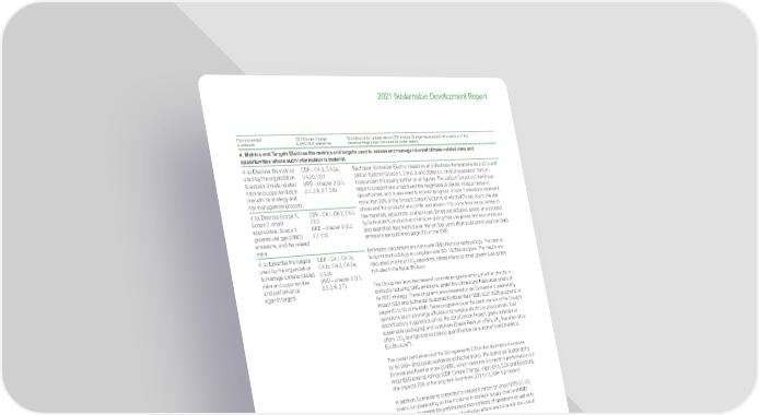 167 Life Is On | Schneider Electric www.se.com 2021 Sustainable Development Report Recommended Disclosure CDP Climate Change & URD 2021 references Brief description (please refer to CDP Climate Change response and other sections of this Universal Registration Document for further details) 4. Metrics and Targets Disclose the metrics and targets used to assess and manage relevant climate-related risks and opportunities where such information is material. 4. a) Disclose the metrics used by the organization to assess climate-related risks and opportunities in line with its strategy and risk management process. CDP – C4.2, C4.2a, C4.2b, C9.1 URD – chapter 2 (2.1, 2.3, 2.6, 2.7, 2.8) Each year, Schneider Electric measures and discloses transparently its end-to-end carbon footprint (Scope 1, 2 and 3) and obtains a “limited assurance” from an independent third party verifier on all figures. The carbon footprint of the Group helps to pinpoint and understand the magnitude of climate-related risks and opportunities, and is also used to monitor progress. Scope 3 emissions represent more than 99% of the Group’s carbon footprint, of which 87% are due to the use phase and the products’ end of life, and around 11% come from the purchase of raw materials, equipment, and services. Emissions induced, saved, and avoided by Schneider’s products and services during their use phase and end-of-life are also quantified. Key metrics over the last four years (from publication year) on GHG emissions are published page 230 of the URD. Emissions calculations are done with GHG Protocol methodology. The carbon footprint methodology is compliant with ISO 14069 principles. The results are calculated in tons of CO 2 equivalent, taking into account all greenhouse gases included in the Kyoto Protocol. The Group has launched several concrete programs aiming at either directly or indirectly reducing GHG emissions, under the Climate and Resources pillars of its 2025 strategy. These programs are presented under Schneider Sustainability Impact (SSI) and Schneider Sustainability Essentials (SSE) 2021-2025 programs in pages 63 to 65 of the URD. These programs cover the performance of the Group’s operations (such as energy efficiency, renewable electricity procurement, fleet electrification), suppliers (such as The Zero Carbon Project, green materials or sustainable packaging) and customers (Green Premium offers, SF 6 -free alternative offers, CO 2 savings and avoidance quantification on customer’s end thanks to EcoStruxure ™ ). The overall performance of the SSI represents 20% in the short-term incentives for 64,000+ employees worldwide (collective share). The Schneider Sustainability External and Relative Index (SSERI), which measures Schneider’s performance in 4 major ESG external ratings (CDP Climate Change, Vigeo Eiris, DJSI and EcoVadis), also impacts 25% of the long-term incentives (LTI) for 2,300+ top leaders. In addition, Schneider is committed to embed a carbon pricing of EUR 30-130 /metric ton (depending on time horizons) in strategic supply chain and R&D decisions, to assess the performance and resiliency of operations as well as to assess whether the investment and reduction efforts are in line with the cost of CO 2 externality. Schneider Electric is a signatory of the Business Ambition for 1.5°C initiative aimed at setting Greenhouse Gas (GHG) emissions reduction targets in line with the global effort to limit warming to 1.5°C. Group short to medium-term targets: • Before 2025, demonstrate that Schneider Electric is carbon positive together with its customers and partners, thanks to CO 2 savings delivered by EcoStruxure ™ ; • On the Group’s operations (scope 1 and 2): be carbon neutral by 2025 (allowing CO 2 offsets) and net-zero CO 2 emissions by 2030; • On indirect emissions (scope 3) in its supply chain and with customers: reduce emissions by -35% by 2030 (versus 2017), by actively engaging suppliers to accelerate their climate strategy, by sourcing greener materials and by proposing more efficient solutions to its customers. The Group’s 2030 targets (net-zero CO 2 emissions on scope 1 and 2, and -35% on scope 3) have been validated 1.5°C-aligned by the Science-Based Target initiative in 2019. Group long-term targets • Become carbon neutral on the Group’s full end-to-end footprint by 2040 (scope 1, 2, and 3), 10 years ahead of 1.5 °C trajectory. This means that all Schneider Electric’s products will be carbon neutral in 2040; • Engage with suppliers to move towards a net-zero CO 2 supply chain by 2050. 4. b) Disclose Scope 1, Scope 2, and if appropriate, Scope 3 greenhouse gas (GHG) emissions, and the related risks. CDP – C6.1, C6.2, C6.3, C6.5 URD – chapter 2 (2.3, 2.7, 2.8) 4. c) Describe the targets used by the organization to manage climate-related risks and opportunities and performance against targets. CDP – C4.1, C4.1a, C4.1b, C4.2, C4.2a, C4.2b URD – chapter 2 (2.1, 2.3, 2.6, 2.7)