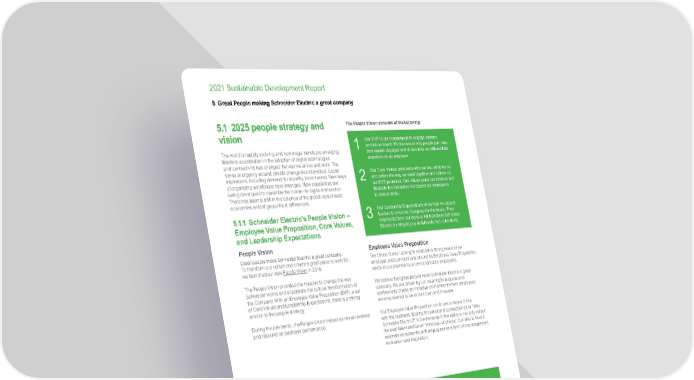 www.se.com Schneider Electric 110 2021 Sustainable Development Report 5 G reat People making Schneider Electric a great company 5. 1 2025 peopl e strategy a nd vision The world i s r ap idly e volving a nd ne w mega-trends a re e merging. Massive acceleration in the adoption of digital technologies and connectivity has changed the way we all live and work. The se nse o f urg ency a round c limate c hange ha s intensified. S ocial aspirations, including demand for equality, have soared. New ways of o rganizing w orkforces ha ve emer ged. N ew c apabilities a re being developed to maximize the human-to-digital intersection. There has been a shift in the balance of the global versus local economies a midst ge opolitical d ifferences. 5.1 .1 Schneider Electric’s Pe ople Vision – Employee Value Proposition, Core Values, and L eadership E xpectations People V ision Great people make Schneider Electric a great company. To t ransform our culture and create a great plac e to work for, we launched our new People Vision in 2018. The People Vision provided the impetus to change the wa y Schneider w orks a nd ac celerate t he cultural t ran sformation a t the Company. With an Employee Value Proposition (EVP), a set of Core Values and Leadership Expectations, there is a strong anchor to the people strategy. During t he p andemic, t he P eople Vision hel ped us r emain resilient and rebound on business performance. T he People Vision consists of the following: 1 Our EVP is our commitment to engage existing and future talent. It’s the reason why people join, stay, and remain engaged and shows how we differentiate ourselves as an employer. 2 Our Core Values determine who we are, what we do, and define the way we work together and deliver on our EVP promises. Our values guide our choices and illustrate the behaviors we expect our employees to demonstrate. 3 Our Leadership Expectations show how we expect leaders to drive the Company for the future. They emphasize how our leaders will transform Schneider Electric by stepping up individually and collectively. Employee Value Proposition The Group is also looking to establish a strong name as an employer and communicate around its Employee Value Proposition, which is our promise to current and future employees. We believe that great people make Schneider Electric a great company. We are driven by our meaningful purpose and continuously create an inclusive environment where employees are empowered to be at their best and innovate. Our Employee Value Proposition continues to evolve in line with the business. Making the emotional connection as to “Why Schneider Electric?” is fundamental in the ability to not only attract the best talent and be an “employer of choice”, but also to have it resonate as authentic with employees as a form of encouragement, motivation and inspiration. Employee Value Proposition MEANINGFUL We empower all to make the most of their energy and resources , ensuring Life Is On everywhere, for everyone, at every moment. Our mission is to provide energy and automation digital solutions for efficiency and sustainability . We adhere to the highest standards of governance and ethics . INCLUSIVE We want to be the most diverse, inclusive and equitable company, globally. We value differences , and welcome people from all walks of life. We believe in equal opportunities for everyone, everywhere. EMPOWERED Freedom breeds innovation . We believe that empowerment generates high performance, personal fulfillment and fun . We empower our people to use their judgement , do the best for our customers , and make the most of their energy .