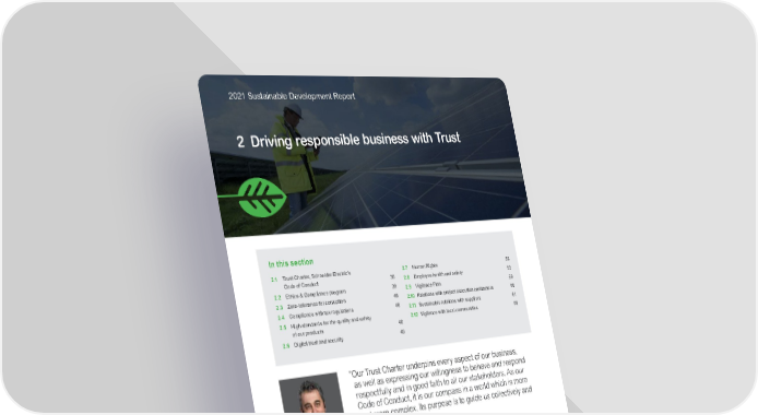 www.se.com Schneider Electric 36 2021 Sustainable Development Report 2021 Sustainable Development Report 2 Driving responsible business with Trust In this section 2 .1 Trust Charter, Schneider Electric’s Code of Conduct 38 2.2 Ethics & Compliance program 39 2.3 Zero-tolerance for corruption 45 2.4 Compliance with tax regulations 46 2.5 High standards for the quality and safety of our products 46 2.6 Digital trust and security 49 2.7 Human Rights 50 2.8 Employee health and safety 53 2.9 Vigilance Plan 56 2 .10 Relations with project execution contractors 60 2 .11 Sustainable relations with suppliers 61 2 .12 Vigilance with local communities 68 “ Our Trust Charter underpins every aspect of our business, as well as expressing our willingness to behave and respond respectfully and in good faith to all our stakeholders. As our Code of Conduct, it is our compass in a world which is more and more complex. Its purpose is to guide us collectively and individually.” Hervé Coureil, Chief Governance Officer and Secretary General Context and goals 2021 has been a year of transformation for Schneider Electric. The Group has set ambitious targets to accelerate the fight against climate change and social inequality, whilst mitigating the impact of the COVID-19 crisis on its operations, supply chain, customers, and employees. To do so, Schneider collaborates for a more sustainable world, and collaboration requires a firm foundation of trust. Present in over 100 countries with diverse standards, values, and practices, Schneider Electric is committed to behaving responsibly in relation to all its stakeholders. Convinced that its responsibility extends beyond compliance with local and international regulations, the Group is engaged to doing business ethically, sustainably, and responsibly. Schneider lives up to the highest standards of corporate governance, through initiatives that monitor and educate teams on ethics, cybersecurity, safety, and quality. The 2021 Trust Charter is the evolution of the Group’s Principles of Responsibility and sets out the expectations of how we work at Schneider and equips teams to confront any unethical behavior they might encounter. Trust serves as an ethical compass for all Schneider Electric’s interactions with stakeholders and all relationships with customers, shareholders, employees, and the communities they serve, in a meaningful, inclusive and positive way. Under our 2025 Sustainability Strategy, we commit to live up to our principles of trust by upholding ourselves and all around us to high social, governance and ethical standards. In this report, we share our progress on the transformations engaged in 2021 under the Trust pillar of our Schneider Sustainability Impact and Schneider Sustainability Essentials programs.