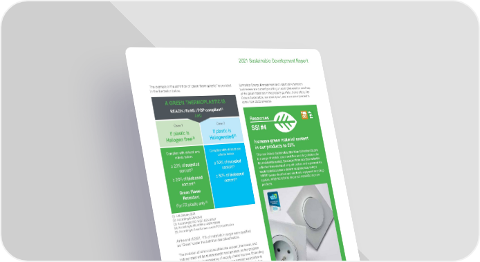 103 Life Is On | Schneider Electric www.se.com 2021 Sustainable Development Report The example of the definition of “green thermoplastic” is provided in the illustration below. A GREEN THERMOPLASTIC IS REACH / RoHS / POP compliant (1) AND Case 1 If plastic is Halogen free (2) Case 2 If plastic is Halogenated (2) ≥ 20% of recycled content (3) ≥ 50% of recycled content (3) Complies with at least one criteria below: Complies with at least one criteria below: ≥ 20% of biobased content (4) ≥ 50% of biobased content (4) Green Flame Retardant For FR plastic only (5) (1) List January 2021 (2) According to EN 50642 (3) According to ISO 14021 & EN 45557 (4) According to EN 16785 or ASTM D6866 (5) According to GreenScreen used in TCO Certification At the end of 2021, 11% of materials in scope were qualified as “Green” under the definition described before. The inclusion of other commodities like copper, thermoset, and indirect steel will be reassessed in next phases, as the program maturity and the transparency of supply chains improve. Extending the Green materials scope to indirect procurement would allow to include new green criteria such as ‘lead-free alloy’, a substitution initiative Schneider Electric is working on to anticipate future regulation on lead. In January 2022, Schneider became a member of Responsible Steel, the world’s first global scheme for responsibly sourced and produced steel. Its mission is to enhance the responsible sourcing, production, use and recycling of steel. Schneider is one of the first steel products consumers outside of the automotive industry to join Responsible Steel. Being a member of Responsible Steel will allow the Group to have a voice to influence the scheme development while fostering opportunities to build strong partnerships with Steel manufacturers and consumers. In 2022, Responsible Steel will launch a standard for the certification of steel products. Schneider Energy Management and Industrial Automation businesses are currently working on an implementation roadmap of the green materials in the projects portfolio. Some offers, like Odace Sustainable, are already out, and more are expected to come from 2022 onwards. Increase green material content in our products to 50% The new Odace Sustainable offer from Schneider Electric is a range of stylish, smart switches and plug solutions for the residential market. Developed from recycled materials collected from electrical drop off centers and supermarkets, wasted plastics enter a circular economy loop using a WEEE (waste electrical and electronic equipment recycling) system, which transforms discarded materials into new products. Resources SSI #4 50% 7% Baseline 2025 target 2021 Progress 11%