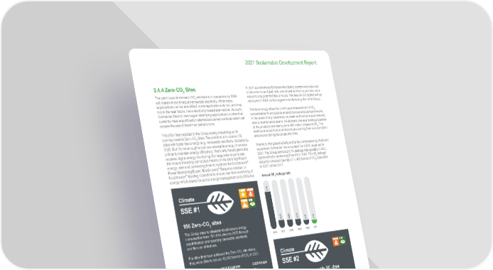 83 Life Is On | Schneider Electric www.se.com 2021 Sustainable Development Report 3.4.4 Zero-CO 2 Sites The path towards net-zero CO 2 emissions in operations by 2030 will require more than just renewable electricity. While many applications can be electrified, some applications do not, and may not in the near future, have electricity-based alternatives. As such, Schneider Electric has begun identifying applications on sites that currently have electrification alternatives as well as those which will require the use of fossil-free fuel solutions. This effort has resulted in the Group newly embarking on its journey towards Zero-CO 2 Sites. The ambition is to source 150 sites with fossil-free energy (e.g., renewable electricity, biofuels) by 2025. But it’s not enough to just use renewable energy; it remains critical to maintain energy efficiency. That’s why the program also requires digital energy monitoring. For large sites in particular, this means installing connected meters on the site’s significant energy uses and connecting them to systems like EcoStruxure ™ Power Monitoring Expert, EcoStruxure ™ Resource Advisor, or EcoStruxure ™ Building Operation to ensure real-time monitoring of energy which allows for active energy management and efficiency. 150 Zero-CO 2 sites The Group aims to eliminate fossil-based energy consumption from 150 of its sites by 2025 through electrification and sourcing renewable electricity and the use of biofuels. For sites that have achieved the Zero-CO 2 site status, they were able to reduce 43,000 tonnes of CO 2 in 2021. Climate SSE #1 150 30 Baseline 2025 target 2021 Progress 0 100 51 3.4.5 Reduction of SF 6 emissions SF 6 gas has excellent insulating properties which have historically helped ensure the safety and quality of certain Schneider Electric products. However, SF 6 gas has a Global Warming Potential (GWP) 25,200 times higher than CO 2 , making it one of the highest GWP gasses. As such, Schneider is innovating its offers to move away from SF 6 gas (SSE #2: 100% substitution with SF 6 -Free medium voltage technologies by 2025). In 2021 the promises from Schneider to deliver new SF 6 -free medium voltage switchgear became a reality with the installation of innovative products on several customer sites. 2021 was the year of the industrialization of several new product lines, free of SF 6 , to prepare the full commercial launch of this new generation of products. In the interim, all Schneider manufacturing plants and R&D laboratories handling SF 6 gas in their processes are actively reducing, as much as possible, SF 6 leaks and emissions during the different phases of their activities. A worldwide community of SF 6 experts are sharing best practices for processes, including procedures, equipment, and training. In 2021 our advanced Emission Monitoring System was improved to become more digital, with centralized monitoring, but also more robust to any potential failure mode. This new kind of system will be deployed in 2022 on the biggest manufacturing site of the Group. This technology allows for continuous measurement of SF 6 concentration in enclosures around devices and piping networks. In the event of any deviations, an alarm notification is automatically sent to maintenance teams. Additionally, the seal testing processes of the products are mainly done with helium instead of SF 6 . This method ensures that no emissions are coming from non-compliant enclosures during the production time. Thanks to this global activity and to the commissioning of efficient equipment, Schneider has exceeded the 0.19% target set for 2021. The Group achieved 0.1% leakage rate globally in 2021, systematically decreasing from 4% in 2008. This SF 6 leakage reduction enabled savings of 11,400 tonnes of CO 2 equivalent in 2021 versus 2017. Annual SF 6 leakage rate 2010 2017 2018 2019 2020 2021 0.10 0.14 0.24 0.26 0.29 1.76 100% substitution with SF 6 -free medium voltage technologies Milan is in the process of powering a fleet of 1,200 eBuses not only with clean energy, but also with green power infrastructure. The innovative SM AirSeT ™ MV switchgear, free of greenhouse gases, are deployed in Milan depots’ charging infrastructure for its bus fleet, to be 100% electric by 2030. Digital and connected solutions allow smart and efficient energy management and ensure greater continuity of service. Climate SSE #2 100% 0% Baseline 2025 target 2021 Progress 0 100 38%