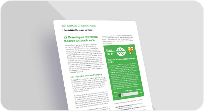 www.se.com Schneider Electric 12 2021 Sustainable Development Report 1 Sustainability at the heart of our strategy 1.3 Measuring our contribution to a more sustainable world Schneider Electric has been an early adopter of transparent disclosures on sustainable revenues, and created its own methodology of “Impact revenues” (1) in 2019, covering offers that bring environmental efficiency to its customers, while not generating any significant harmful impact to the environment, and excluding revenues from carbon intensive segments. Recently, the European Union (EU) has shown international leadership by being the first to develop a Regulation and Taxonomy aiming at driving investments towards environmentally sustainable activities, which the Group applauds. Both methodologies are somewhat aligned but currently differ in the scope of eligible activities, and in end- segments exclusions. The Group is supportive of a better alignment over the next years to provide its multinational stakeholders with standardized metrics and empower them to shape a more sustainable future for all. 1.3.1 A purpose-led, Impact Company Schneider Electric’s purpose is to empower all to make the most of our energy and resources, bridging progress and sustainability for all. The Group’s differentiation lies in its complementary actions to demonstrate outstanding environmental, social, and ethical performance, and to support its customers in their Net-zero CO 2 journey. Schneider is the digital partner of its customers for sustainability and efficiency. The Group proposes an integrated offering of technologies and market-leading solutions tailored to customer needs, promoting the transition towards more electric, digital, decarbonized, and decentralized energy. Those active energy efficiency solutions - which consist of optimizing the entire energy cycle using energy control products, systems, services, and software – help mitigate, adapt, and improve humanity’s resilience to climate change. Schneider Electric quantifies this climate impact as part of Schneider Sustainability Impact (SSI) and is committed to help its customers save and avoid 800 million tonnes of CO 2 by 2025 (cumulated since 2018). As of end 2021, the Group delivered 347 million tonnes of CO 2 e of this commitment. The methodology and results of this indicator are audited every year as part of the extra-financial audit. 1.3.2 Early-adopter of transparent disclosures on sustainable revenues For more than fifteen years, Schneider Electric has led by example and transparently presented its sustainability performance to its stakeholders, across all environmental, social and governance topics and tried to develop new market practices, such as its saved and avoided CO 2 methodology or biodiversity footprint. In 2019, the Group was one of the first companies to proactively disclose information on the share of its revenue coming from offers that bring energy, climate, or resource efficiency to its customers, while not generating any significant harmful impact to the environment. Originally called “Green Revenues” to match market standards, such sales were renamed “Schneider Impact revenues” (1) to avoid any confusion with the new European (1) Schneider Impact revenues are calculated using Schneider’s own consistent methodology and are distinct from turnover eligible under the EU Taxonomy Taxonomy coming into force. In 2021, the Group took a step further by committing that Schneider Impact revenues reach 80% of Group sales by 2025 as part of its SSI. It is worth noting that each year the performance of the SSI impacts short-term incentive plans for 64,000 employees. Grow our Schneider Impact revenues to 80% The Group supported the Hong Kong University of Science and Technology (HKUST) as part of its plan to deploy an integrated data center solution to provide effective operation and management, ensuring high reliability and 24/7 availability, as well as full visibility for day-to-day monitoring of all systems and processes. Schneider proposed EcoStruxure ™ for Data Center, an open, interoperable, IoT-enabled system architecture and platform. It leverages advancements in IoT, mobility, sensing, cloud and big data analytics technologies to bring unprecedented insight into data center operations through our connected products, edge control, apps, analytics and services. As a result, HKUST achieve significant energy saving and their power usage effectiveness (PUE) rating more than doubled. Climate SSI #1 80% 70% Baseline 2025 target 2021 Progress 71% Schneider Impact revenues can be split into four categories: 1. Energy efficiency architectures bringing energy and/or resource efficiency to customers. 2. Grid reinforcement and smart grid architectures contributing to electrification and decarbonization. 3. Products with differentiating green performance , flagged thanks to our Green Premium ™ program. 4. Services that bring benefits for circularity (prolonged asset lifetime and uptime, optimized maintenance operations, repair, and refurbish) and energy efficiency (maintenance to maintain the operational performance of equipment and avoid a decrease of energy efficiency over time). Additionally, revenues derived from activities with fossil sectors and others are systematically excluded, including Oil & Gas, coal mining, and fossil-power generation, in line with prevailing corporate responsibility reporting and sustainable finance practices, even though Schneider Electric’s technologies deliver resource and carbon efficiency in such sectors as well. In line with Schneider Electric’s strategy to phase out SF 6 from offers by 2025, SF 6 -containing switchgear for medium voltage applications are also excluded. In addition, neutral technologies such as signaling, racks and enclosures, access control, or emergency lighting are excluded.