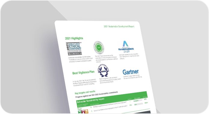 37 Life Is On | Schneider Electric www.se.com 2021 Sustainable Development Report 2021 Highlights TRUST T e a m s C u s t o m e r s a n d P a r t n e r s C u s t o m e r s a n d P a r t n e r s I n v e s t o r s C o m m u n i t i e s E t h i c s C y b e r s e c u r i t y S a f e t y Q u a l i t y S u s t a i n a b i l i t y Schneider was awarded the Ethisphere ‘most ethical company in the world’ in 2021 and 2022, for eleven consecutive years. The 2021 Trust Charter sets out the expectations of how we work at Schneider and equips teams to confront any unethical behavior. Schneider awarded the 2021 ‘Grand Prix de la Transparence’ in the ESG information category. Best Vigilance Plan In January 2021, the Group was awarded the Best Vigilance Plan by the Sustainable Investment Forum and A2 Consulting. Triple recognition in UK and Ireland demonstrating excellence in safety, health and environmental impact. Gartner #1 Supply Chain in Europe Our second consecutive year at the top. Key targets and results Progress against our 2021-2025 Sustainability commitments Schneider Sustainability Impact Long-term commitments aligned to UN SDGs 2021-2025 programs Baseline (1) 2021 progress (2) 2025 Target Tr ust 6. Strategic suppliers who provide decent work to their employees (3) -- In progress 100% 7. Level of confidence of our employees to report unethical conduct 81% +0pts +10pts Schneider Sustainability Essentials Long-term commitments aligned to UN SDGs 2021-2025 programs Baseline (1) 2021 progress (2) 2025 Target Tr ust 12. Deploy a ‘Social Excellence’ program through multiple tiers of suppliers (3) -- In progress -- 13. Train our employees on Cybersecurity and Ethics every year 90% 96% 100% 14. Decrease the Medical Incident rate 0.79 0.65 0.38 15. Reduce scrap from safety units recalled 4,202 4,024 2 ,101 16. Be in the Top 25% in external ratings for Cybersecurity performance Top 25% Top 25% Top 25% 17. Assess our suppliers under our ‘Vigilance Program’ 374 1,203 4,000 (1) Generally, the 2020 performance serves as a baseline for Schneider Sustainability Impact (SSI) and Schneider Sustainability Essentials (SSE) 2021-2025 programs. (2) Each year, Schneider Electric obtains a “limited” level of assurance from an independent third party verifier for all of the SSI and SSE indicators (except for SSI #6, SSI #7, SSI #+1, SSE #12 and SSE #23), in accordance with ISAE 3000 assurance standard (for more information, please refer to the Universal Registration Document). The 2021 performance is also discussed in more details in this section. (3) 2021 performance is in progress for SSI #6 Decent work and SSE #12 ‘Social Excellence’ because the programs are still in development.