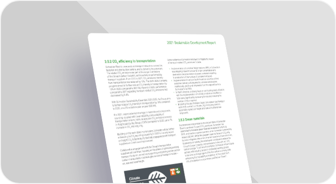 85 Life Is On | Schneider Electric www.se.com 2021 Sustainable Development Report 3.5.2 CO 2 efficiency in transportation Schneider Electric uses a robust transport network to connect its factories and distribution centers, and to deliver to its customers. The related CO 2 emissions are part of the scope 3 emissions of the Group’s carbon footprint, as this activity is performed by transport suppliers. From 2015 to 2017, CO 2 emissions intensity from transportation was reduced by 10%. The 2018-2020 Company program aimed to further reduce CO 2 intensity in transportation by 10% in 2020 compared to 2017. By the end of 2020, performance compared to 2017 regarding transport-related CO 2 emissions had decreased by 8.4%. With Schneider Sustainability Essentials 2021-2025, the Group aims to further reduce CO 2 intensity in transportation by 15% compared to 2020, or a 3% reduction year on year (SSE #4). For 2021, unprecedented shortage in materials and components sourcing, coupled with lower reliability and availability of transportation means, led to an absolute CO 2 emissions increase in freight paid by the Group of 24% (compared to 2020), yet a 1% increase in CO 2 intensity only. Building on the work done in prior years, Schneider will be further enhancing its CO 2 reporting capability in 2022 to not only report on freight CO 2 footprint but to facilitate engagement with transport suppliers on continuous improvement. Collaborative engagement with the Group’s transportation suppliers will continue, focusing on the pillars of optimizing existing transport footprint, as well as supporting and piloting advanced low carbon transportation technologies across all transport modes – air, sea and road freight. 15% CO 2 efficiency in transportation As part of its efforts to reduce the CO 2 intensity of transportation, Schneider Electric is piloting low-carbon transportation technologies such as electric and hybrid vehicles. For instance, on the East Coast of the USA, electric terminal trucks are used by a final mile transport partner to move containers between the Distribution Center and the Port’s Terminal. Climate SSE #4 15% 0% Baseline 2025 target 2021 Progress 0 100 -1% Some evidence of Schneider initiatives to mitigate the impact of transport-related CO 2 emissions include: • Implementation of container freight stations (CFS) in Schneider’s sea shipping network to allow for origin consolidation and destination deconsolidation of ocean containers resulting in a reduction of the number of containers shipped. • Implementation in various South American countries of final customer delivery utilizing electric vehicles and bicycles. Additionally, piloting rail shipments from the regional ports to Schneider’s facilities. • In North America, a strong focus on our trucking asset utilization with the implementation of multi-deck trailers on the Mexico- USA lane, significantly increasing fill-rate and reducing the number of trips required. • Exploring the use of smaller, faster, zero carbon sea transport options to connect our shorter, high-frequency lanes to potentially replace air freight and reduce traditional sea shipments. 3.5.3 Green materials Purchases are responsible for the largest share of Schneider Electric upstream Scope 3 CO 2 emissions. Schneider has committed to increase green materials in products to 50% by 2025, and tracks progress quarterly under Schneider Sustainability Impact (SSI #4). While this program does not focus on CO 2 only, but also mitigates other environmental impacts such as resources, biodiversity or toxicity, this initiative will contribute to reduce the Group’s Scope 3 supply chain emissions, in line with its 1.5°C carbon pledge. To achieve this ambition, Schneider will participate actively with industry leaders in dedicated working groups to become a change agent of the low-carbon economy while enhancing the traceability of materials. At the end of 2021, 11% of materials in scope where qualified as “Green”.