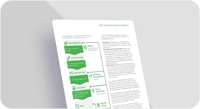 91 Life Is On | Schneider Electric www.se.com 2021 Sustainable Development Report In the image below, an overview of circular initiatives at Schneider Electric, over the whole value chain. Mining/Minerals Product Design Manufacturing Distribution User Recycle Take-back and end of life management Refurbish/ Remanufacture ECOFIT TM Reuse/ Redistribute “Circular Certified” Maintain/ prolong Services, Asset performance managment 50% Green materials in products 80% of product revenues from Green Premium TM 200 ‘Waste to Resource’ sites 100% of packaging free from single-use plastic and with recycled cardboard Collection 4 .1.1 G ove r n a n c e At Schneider Electric, environmental considerations are integrated in the Group’s strategy, R&D, manufacturing, procurement, finance, human resources, transportation, sales, marketing, services, and the way value propositions to customers are spelt out. To deliver ambitions, environmental transformations are driven by a global network of over 600 managers and experts responsible for the environmental management of sites, countries, product design, and marketing. The network of leaders driving environmental transformations consists of the following: • For the design and development of new offers: Sustainable Offers Managers and leaders in each business are in charge of integrating key environmental considerations into the development of new products and producing expected environmental information for customers. • For the management of industrial, logistics, and large tertiary sites: Safety, Environment, and Real Estate Vice- Presidents are nominated in each region, with dedicated teams. They are responsible for implementing the Group’s policies across all sites in their geographical remit. In each region, directors coordinate teams across a group of sites (clusters), as well as on site. These environmental and safety leaders are in charge of reporting on performance as well as executing environmental progress plans in the field. • For logistics: the Logistics Senior Vice-President and his/ her teams within the Global Supply Chain department are in charge of reducing and measuring CO 2 emissions from freight at Group level. • For countries and commercial entities: environment and safety champions are appointed in each country and are responsible for local reporting actions where necessary; monitoring regulations, taxes, and national opportunities as applicable (e.g., national transcriptions of the WEEE in relation to end-of-life product management, and monitoring national substance regulation such as RoHS China); the proactive management of local environmental initiatives; and relations with local stakeholders. • Edison experts: a process recognizes individuals who have a specific expertise that the Group is eager to maintain and grow. There are 10 specific domains in which Edisons are identified, one of them being environment. Each year, an environment Edison is expected to dedicate 10% to 20% of his/her time to lead a global initiative related to his/her expertise, such as the development of an e-learning course, a new standard, or an innovation. Various governance bodies enable those communities to meet every month or quarter to ensure consistent adoption of environmental policies and standards throughout the Group. This network has access to a wide range of resources including standards, policies, best practices, benchmarks, and guidelines, all of which are shared on the dedicated intranet site and databases. Environmental performance is reported and discussed during leadership meetings of concerned entities, including Global Supply Chain leadership meetings, Sustainable Innovation Taskforce with business units, the Board Audit & Risks Committee, Board of Directors, Executive Committee, Human Resources & CSR Committee, and Group Sustainability Committee. To educate all employees on sustainability, an Essential Sustainability e-learning training was rolled-out in 2021, including a presentation of the Group’s carbon pledge and the roadmap for execution. In addition, various e-learning modules have been developed on topics such as climate and biodiversity. Additionally, an environment intranet site is accessible to all employees, informing them about the ongoing programs, best practices, results, goals, and upcoming deadlines. In 2019, Schneider Electric launched a company-wide initiative named Act for Green whereby each of its employees can share their suggestions on how the Group can “Green” its operations. In 2020, thanks to the suggestions of many employees, the #stopsingleuseplastic initiative to ban the single use of plastics was launched and integrated in 2021 as part of a biodiversity for sites program (SSE #8). Communities of passionate ambassadors facilitate e-learning and workshops (such as Climate Fresk) to increase awareness on climate change. On June 5, 2021, on United Nations World Environment Day, as it has been the case for each year over the last eight years, Schneider organized its annual “Global Environment Day” event involving tens of thousands of Group employees, inviting them to celebrate and to share innovations in the areas of climate and the circular economy, both internally to the Group and externally, in association with local communities. That year, a special focus was made on the importance of the ecosystem restoration.