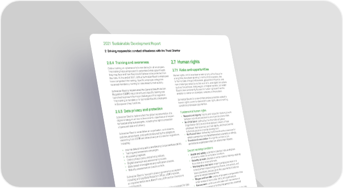 www.se.com Schneider Electric 50 2021 Sustainable Development Report 2 Driving responsible conduct of business with the Trust Charter 2.6.4 Training and awareness Online training on cybersecurity is mandatory for all employees. This training helps employees to understand what cyber threats they may face and how they should behave to be protected from the risks. At the end of 2021, 99% of Schneider Electric employees have completed this training. Specific employee categories received mandatory training for risks linked to their activity. Schneider Electric implemented the General Data Protection Regulation (GDPR) requirements and specific training was launched to present the major challenges of this regulation. This training is mandatory for Schneider Electric employees in Europe and key functions. 2.6.5 Data privacy and protection Schneider Electric believes that the global implementation of a digital strategy must reconcile economic objectives and respect for fundamental human rights, including the right to protection of personal data and privacy. Schneider Electric establishes an organization, work streams, policies, procedures, and controls required by the obligations stemming from GDPR and data privacy and protection regulations, including: • Internal data privacy policy and Binding Corporate Rules (BCR). • Training and awareness campaigns. • Processing registers. • Online privacy policy and privacy notices. • Digital assets privacy assessment process. • Data breach management and notification process. • Maturity assessment and audit controls. Schneider Electric has put in place a governance ecosystem including a Group Data Protection Officer, a DPO network, an implementation team, Data Privacy & Protection Champions and Steercos. In 2021, Schneider Electric has strengthened its processes for data breach management, including specific training. It has deployed several awareness programs including on International Data Protection Day and on events management. Schneider Electric has also been rolling out its Global Data Privacy & Protection compliance approach beyond GDPR in China, the USA, and India and in globalizing its standards. A new data protection addendum has been deployed, including the new Standard Contractual Clauses of the European Commission. 2.7 Human rights 2.7.1 Risks and opportunities Human rights, which have been a main priority of the Group for a long time, have been growing in terms of risk exposure, due to the increase of legal enforcement, geopolitical influence, and new challenges raised by social, economic, and digital disruptions such as forced labor, living wages, or migrant workers. Schneider Electric has consistently focused on human rights and has the ambition to remain an exemplary company on this subject. Schneider Electric’s review of risks and opportunities related to human rights covers fundamental human rights, decent working conditions and equal opportunities. Fundamental human rights • Respect and dignity: healthy and respectful relations at work between individuals and teams, and towards communities. • No Child labor: defined by the International Labour Organization (ILO) as work that deprives children of their childhood, their potential, and their dignity, and that is harmful to their physical and mental development. • No Forced labor: defined by the ILO as all works or services for which a person has not offered themselves voluntarily or willingly. • Freedom of association: the right for workers to join professional organizations that can defend their interests. Decent working conditions • Health and safety: potential incidents of various degrees of severity related to workplace conditions. • Security at work: physical or verbal violence that may originate from internal or external threats. • Working time and leave: ensuring employees work on a schedule that respects legal time frames, rest periods, and leave provisions, and are given the opportunity to balance personal and professional time. • Wages and benefits: paying employees a compensation that is fair in view of their profile, skills, and qualifications. • Harassment: continuous solicitation with the intention of exhausting a person or forcing that person into unwanted behavior. • Data privacy: securing the data that individuals are placing into the Company’s hands so that their privacy and freedom remain safe and protected. Equal opportunities • Discrimination: creating a situation of inequality based on an employee’s personal characteristic, at work or when hiring. • Diversity and inclusion: risk of introducing several biases that would result in an unbalanced representation of the society inside the Company, and the exclusion of some groups or communities from the Company. • Development of competencies: giving employees the opportunity to learn, maintain, and develop their skills and abilities.