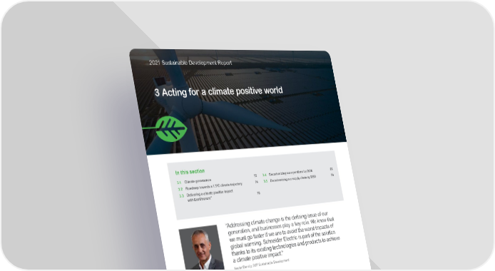 www.se.com Schneider Electric 70 2021 Sustainable Development Report 2021 Sustainable Development Report 3 Acting for a climate positive world In this section 3.1 Climate governance 72 3.2 Roadmap towards a 1.5°C climate trajectory 74 3.3 Delivering a climate positive impact with EcoStruxure ™ 78 3.4 Decarbonizing our operations by 2030 80 3.5 Decarbonizing our supply chain by 2050 84 “ Addressing climate change is the defining issue of our generation, and businesses play a key role. We know that we must go faster if we are to avoid the worst impacts of global warming. Schneider Electric is part of the solution thanks to its existing technologies and products to achieve a climate positive impact.” Xavier Denoly, SVP Sustainable Development Context and goals 2021 was a year of acceleration, building on the lessons learned from 2020. Acceleration of our collective realization of the fragility of the world’s ecosystems, climate, resources, biodiversity, and even human lives. The magnitude of changes needed will not accept incremental year-on-year progress. What is now needed is to place a planet-first lens onto our collective development path: are we living under the limits of one planet? As science tells us this is not the case, let us instead work backwards and define what needs to be done to maintain climate under a 1.5°C global temperature increase and preserve biodiversity and resources. Companies all over the world are accelerating to align business strategies with a 1.5°C trajectory. Since 2018, the number of companies with targets approved by the Science Based Targets Initiative has doubled every year, to reach over 1,000 companies in 2021, including Schneider Electric. Another 1,000 companies are committed to set such targets soon. Because it strives to be an Impact Company, the Group’s climate strategy addresses all its stakeholders, from employees to supply chain partners, customers, as well as local communities and institutions, and shows there are ways for companies to “do good while doing well”. Concrete actions for the 2021-2025 period are monitored and shared transparently in Schneider Sustainability Impact and Essentials and are overseen by various dedicated Committees up to the Board of Directors. In the longer term, the Group is committed to net-zero CO 2 emissions in its operations by 2030, and took specific commitments for renewable electricity, energy efficiency and electric vehicles under the RE100, EP100, and EV100 initiatives. By 2040, the Group will be carbon neutral along the whole of its value chain, meaning all products will be carbon neutral. Importantly, beyond targeting excellence in reducing its own footprint, Schneider Electric also delivers about 100 million tonnes CO 2 gains to its customers each year with EcoStruxure ™ .