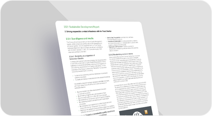www.se.com Schneider Electric 48 2021 Sustainable Development Report 2 Driving responsible conduct of business with the Trust Charter 2.5.4 Due diligence and results The Group policy is supported by a robust Quality Management System, which is improved continuously to fulfill expectations of all relevant parties. It is in full alignment with our Trust Charter, Schneider Electric’s Code of Conduct, as well as in compliance with ISO 9001 standard. In 2021, 231 Schneider supply chain sites were certified to ISO 9001. 2.5.4.1 Reliability as a signature of Schneider Electric To ensure improvement in the area of design, the Group launched in mid-2020, a dedicated program, ReeD (Reliability End To End byDesign), to secure fundamentals and ensure full integration of new customer expectations (from Quality to Reliability). It is the obsession of the Group to ensure that “Reliability” is a signature value of Schneider Electric branding: • To deliver an outstanding customer satisfaction on products/ systems robustness • To create and deploy an easy access to the relevant knowledge This reliability program has been designed with R&D at its heart, with huge interactions with all functions and businesses of Schneider Electric: • By ensuring that new offers development is focused on customer promises. • By animating mitigation plan until deviation is fixed. • By ensuring Excellence in Offer Life Cycle changes. • By transitioning from product quality to systems reliability. • By combining people’s competency with robust digital processes. • By leveraging more digital tools to detect issues early and reduce the number of bugs seen by customers. • Reinforce risk analysis to ensure proper usage of our systems, software, and products to prevent associated issues and risks. 2.5.4.2 Towards a sustainable quality excellence for an ultimate customer experience Thanks to the implementation of a robustness program, Schneider Electric fosters a quality culture by boosting the basics to secure cultural transformation towards Sustainable Quality Excellence for premium customer experience through solid foundations such as people, organization, robustness, and suppliers. For full visibility all along the supply chain, the scope of action has been extended outside and inside Schneider Electric. It is the will of the group to move from a reactive to a predictive mode, leveraging digital and analytics, and building an integration layer that connects critical offers. Six digital streams have been designed to achieve defined goals: • Suppliers Process Monitoring to build with suppliers the capabilities of real time process control. • Manufacturing Process Monitoring to build with factories the capabilities of real time process control. • Logistics Process Monitoring to build the capability of real time process control in Schneider Electric’s logistics operations. • End-to-End Traceability to serialize, track, and trace Schneider Electric’s products. • Analytics & Optimization to leverage descriptive, predictive, and prescriptive analytics on data generated to get actionable insights to improve industrial quality. • Digitization of Processes to digitize processes for simplification, transparency, and robustness while capturing data for analytics. 2.5.4.3 Revalorising customer returns When sustainability supports Customer Satisfaction, it translates into new processes and policies to allow returns of adapted products for reuse, remanufacture and refurbishment. The strong collaboration between Sustainability, Global Supply Chain, Lines of Business and Customer Satisfaction and Quality teams imagine these new processes, enabling Schneider Electric to revalorize customers returns through reuse of components or remanufacture of new products in Local Adaptation Centers. The benefits can be seen at customer satisfaction level: by producing and delivering back order impacted by components in shortages, by serving new customers orders and on Sustainability level with anticipation of upcoming regulation compliance (Anti-Waste law), reducing carbon footprint of our supply chain and reducing cost of non quality due to product scrap. Schneider Electric has an Offer Safety Alert (OSA) process to alert the relevant Line of Business and other interested parties as soon as it is suspected that customers’ health or property safety may be put at risk by Schneider products, solutions, or projects. The Offer Safety Alert Committee (OSAC) is a permanent corporate committee that oversees and regulates the management of OSA. Its mission is to ensure all OSA are managed with the due diligence and urgency to minimize safety risks to customers. Its independent, multi-discipline nature allows the OSAC to make decisions in our customers’ best interest. As part of the Trust pillar of Schneider Sustainability Essentials 2021-2025, Schneider is committed to reduce by 50% the weight of scrap from safety units recalled by 2025 (SSE #15). 50% reduction in scrap from safety units recalled In 2021 the Group recalled 14 products as approved by the Offer Safety Alert Committee. The Customer Satisfaction & Quality team reaches out to customers impacted by the recall to arrange for product replacement. Investigation will be conducted on products returned to Schneider’s premises to determine the final root cause of the safety issue. The returned product thereafter will be assessed on its reusability and parts which could not be reused will be scrapped according to the local environmental regulations. Tr ust SSE #15 2 ,101 4,202 Baseline 2025 target 2021 Progress 0 100 4,024