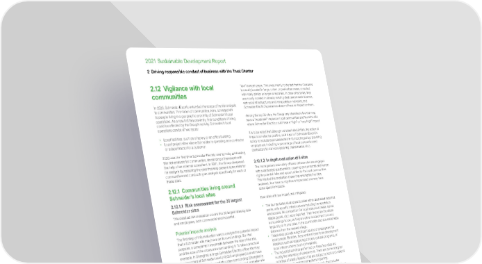 www.se.com Schneider Electric 68 2021 Sustainable Development Report 2.12 Vigilance with local communities In 2020, Schneider Electric extended the scope of its risk analysis to communities. The notion of communities, here, corresponds to people living in a geographic proximity of Schneider’s local operations. As a result of this proximity, their conditions of living could be affected by the Group’s activity. Schneider’s local operations can be of two types: • Local facilities, such as a factory or an office building. • Local project sites where Schneider is operating as a contractor or subcontractor for a customer. 2020 was the first time Schneider Electric was formally addressing this risk analysis for communities, developing a framework with the help of an external consultant. In 2021, the Group deepened its analysis by selecting the sites that may present some risks for communities and conducting an analysis specifically for each of these sites. 2.12.1 Communities living around Schneider’s local sites 2.12.1.1 Risk assessment for the 30 largest Schneider sites This detailed risk evaluation covers the 30 largest sites by size and employees, both commercial and industrial. Potential impacts analysis The first step of this evaluation was to analyze the potential impact that a Schneider site may have on its surroundings. For that purpose, a comparison was made between the size of the site, and the size of the urban area surrounding it. To take a practical example, in Shanghai, a large Schneider Electric office site may be important at Schneider level (>2,000 employees) but will have very little impact on its immediate urban surrounding (Shanghai is a multi-million inhabitants city). On the opposite end, a smaller site may have a bigger impact on its rural surrounding in Africa or South Asia. Risk nature and level The second step was to qualify the natures of risk and their level, using public data available at country level on topics such as ethical standards (National Corruption Index), individual development (Human Development Index), or health and human rights (Human Right score). Using this data, a composite country risk index was built to reflect the risk level for countries where Schneider’s main sites are located. Conclusions The third step was to combine Schneider’s site impact level with the composite country risk index. The overall result shows that the level of risk on local communities living around Schneider Electric sites is “low” in most cases. This owes mainly to the fact that the Company is usually located in large, urban, or peri-urban areas, crowded with many similar or larger companies. In case of factories, they are mostly located in already existing dedicated industrial areas, with solid infrastructures and transportation networks, and Schneider Electric’s presence does not have an impact on them. Among the top 30 sites, the Group only identified a few that may have a “moderate” impact on local communities and found no site where Schneider Electric could have a “high” or “very high” impact. It is to be noted that although we speak about risks, the notion of impact can also be positive, as it is part of Schneider Electric’s policy to include local parameters in its sourcing policy: providing employment; including a percentage of local companies and contractors for services (catering, maintenance, etc.). 2.12.1.2 In depth evaluation of 5 sites The management and safety officers of these sites are engaged with a dedicated questionnaire, covering environmental and human rights potential risks and opportunities for the local communities. The result of the evaluation shows that among the five sites reviewed, four have no significant impact and one may have some specific impacts. Four sites with low impact, well mitigated: • The four factories studied are located within dedicated industrial parks, with specific infrastructures including transportation and access. No competition for local resources (water, power, staple goods, etc.) were reported. Their impact on the urban surroundings is low, as they are either located next to a very large city, or in one case, in the countryside and at a reasonable distance from the nearest village. • These sites provide a significant source of employment for local people. Besides, these entities foster local development initiatives such as supporting schools, cultural programs, or local infrastructures (such as hospitals). • The industrial activities performed on these four sites are mostly the assembly of components. There are some marginal activities of plastic injection that are subject to local and national regulations, with regular compulsory reporting. • One of the sites is part of an industrial park, that includes housing facilities for workers (dormitories). These facilities have been recently enhanced, are compliant to local standards, and have not been subject to any specific alert report. However, they remain a point of attention and follow-up on Schneider’s side. One site with medium risk, mitigation actions in progress: • This specific site is hosting an industrial process that involves the use of chemicals. Although these are not critical and restricted substances, they are required to be monitored and processed specifically. • The site is located close to a small urban area, therefore risks of marginal pollution are present. • Several mitigation actions have been implemented by the local team. A specific review of the adequacy of these measures is in progress. 2 Driving responsible conduct of business with the Trust Charter