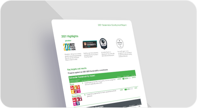 109 Life Is On | Schneider Electric www.se.com 2021 Sustainable Development Report 2021 Highlights Glassdoor rating is on a steady growth, recognizing Schneider Electric as one of the Best Place to Work for 2021. The Financial Times awarded Schneider Electric the title of ‘Diversity leader’. Schneider Electric in Universum’s Top-25 World’s Most Attractive Employers. For the fifth year in a row, recognition for our commitment to gender equality and building a culture of inclusion. Key targets and results Progress against our 2021-2025 Sustainability commitments Schneider Sustainability Impact Long-term commitments aligned to UN SDGs 2021-2025 programs Baseline (1) 2021 progress (2) 2025 Target Equal 8. Increase gender diversity in hiring (50%), front-line management (40%) and leadership teams (30%) 41/25/24 0 100 41/27/26 50/40/30 Generations 10. Double hiring opportunities for interns, apprentices and fresh graduates 4,939 0 100 x1.25 x2.00 Schneider Sustainability Essentials Long-term commitments aligned to UN SDGs 2021-2025 programs Baseline (1) 2021 progress (2) 2025 Target Equal 18. Reduce pay gap for both females and males F: -1.73% M: 1.00% -1.61% 1.11% <1% 19. Increase subscription in our yearly Worldwide Employee Share Ownership Plan (WESOP) 53% 61% 60% 20. Pay our employees at least a living wage (3) 99% 100% 100% 21. Multiply the number of employee-driven development interactions on the Open Talent Market 5,019 x2.1 x4 Generations 22. Support the digital upskilling of our employees 41% 74% 90% 23. Provide access to meaningful career development programs for employees during later stages of their career -- In progress 90% 24. Increase our employee engagement level 69% 71% 75% (1) Generally, the 2020 performance serves as a baseline for Schneider Sustainability Impact (SSI) and Schneider Sustainability Essentials (SSE) 2021-2025 programs. (2) Each year, Schneider Electric obtains a “limited” assurance on progress and methodology from an independent third party verifier for all of the SSI and SSE indicators, in accordance with ISAE 3000 assurance standard (for more information, please refer to the Universal Registration Document). The 2021 performance is also discussed in more details in this section. (3) As of 31 st December 2021, 99.99% of eligible employees, i.e. all Schneider employees treated as permanent workforce, were paid the living wage. The few remaining gaps were closed early 2022 so that all in scope Schneider Electric employees are now paid the living wage. The final KPI result for 2021 was rounded to 100%.