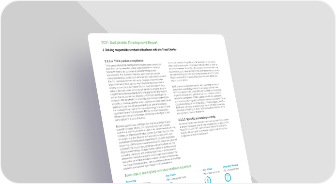www.se.com Schneider Electric 42 2021 Sustainable Development Report 2 Driving responsible conduct of business with the Trust Charter 2.2.2.4 Third-parties compliance Third-party relationship management programs are complex as each third party presents multiple risks and different oversight functions need to be consulted to perform individual risk assessments. For example, business agents can be used for many legitimate purposes, such as to perform tasks that Schneider Electric cannot perform as efficiently; however, experience has shown that using them can be very risky in terms of exposure to bribery or corruption. Schneider Electric Business Agent Policy sets out the rules under which we will determine whether there is a legitimate business purpose before engaging. We also need to ensure that we conduct an effective and efficient due diligence review to ultimately make the most informed decision and mitigate any risks to the best possible extent. We have adopted a risk-based approach to our due diligence enabling our teams to dedicate the most significant part of their time and energy to situations that represent the most risk exposure. Hence, we have various due diligence policies and processes depending on the type of third party subject to the due diligence. Business agents cover all third parties retained entirely or in part to assist Schneider Electric, directly or indirectly, in its business operations, including to obtain a sales order, contract award, permits, licenses, or other business advantage for Schneider Electric. They are subject to a due diligence and approval process, which was centralized with the Business Agent Policy in 2019 with digitization beginning in 2020. Several documents and information are gathered and sent to the Group Compliance team who will perform the due diligence and manage the approval process by analyzing risks of corruption, sanctions, and unethical practices. At the first level of assessment, the business agent could be approved based on the level of risk, or additional checks could be carried out if necessary. The Group Compliance team can request to also review and validate payments to a business agent based on this assessment. Our robust network of suppliers is the foundation of our supply chain, and we extend the same level of ethical control to them as we do to ourselves. Since 2021, the Group Compliance team has been working to further strengthen the controls carried out as well as understanding our risks when doing business with Schneider Electric customers in close collaboration with both digital and export control teams. M&A operations represent specific risks regarding ethics and compliance, specifically corruption and export control risks. With the support of the Group Ethics & Compliance Committee, a specific process and guidelines were put in place in 2020 to ensure full compliance of M&A operations with anti-corruption and export control regulations: this process was built by the Group Compliance Director, the Global Export Control Director, and the M&A team, ensuring a methodology that fit with M&A processes and ways of working. In 2021, this process was extended to the management of Human Rights risk. 2.2.2.5 Specific accounting controls Schneider Electric has developed accounting control procedures to ensure that books, records, and accounts are not used to hide fraud. Since June 2021, work has been initiated to strengthen specific anti-corruption controls for a defined set of sensitive- judged accounts and transactions. Seven steps to securing long-term value creation in acquisitions 1 4 6 7 2 3 5 Screening Business + Corp. Strategy Day 1 Gate PMI + Integration Team Due Diligence M&A, Functions, Consultants NBO Non-Binding offer Signing Definitive Agreements Timing depends on conditions precedents (such as clearance with Anti-trust Authorities) PMI = Post-Merger Integration Team Closing Funds & Shares Transfer Year 1 Gate PMI + Business Team Integration Wrap up PMI + Business Team Monitoring starts Strategic objectives, performance & synergies 100 Days Gate PMI + Integration Team Post Year 1 Gate PMI + Business Team