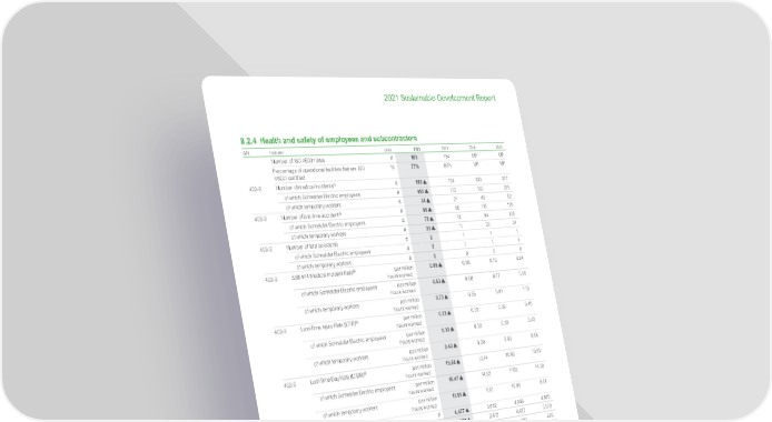 181 Life Is On | Schneider Electric www.se.com 2021 Sustainable Development Report 8.2.4 Health and safety of employees and subcontractors GRI Indicator Units 2021 2020 2019 2018 Number of ISO 45001 sites # 180 184 UP UP Percentage of operational facilities that are ISO 45001 certified % 77% 80% UP UP 403-2 Number of medical incidents (1) # 186 154 233 277 of which Schneider Electric employees # 152 133 193 225 of which temporary workers # 34 21 40 52 403-2 Number of lost-time accident (1) # 96 85 116 136 of which Schneider Electric employees # 76 74 94 105 of which temporary workers # 20 11 22 31 403-2 Number of fatal accidents # 2 1 1 1 of which Schneider Electric employees # 2 1 1 1 of which temporary workers # 0 0 0 0 403-2 SSE #14 Medical Incident Rate (2) per million hours worked 0.65 0.58 0.79 0.94 of which Schneider Electric employees per million hours worked 0.63 0.58 0.77 0.90 of which temporary workers per million hours worked 0.73 0.55 0.91 1.10 403-2 Lost-Time Injury Rate (LTIR) (2) per million hours worked 0.33 0.32 0.39 0.46 of which Schneider Electric employees per million hours worked 0.32 0.32 0.38 0.42 of which temporary workers per million hours worked 0.43 0.29 0.50 0.66 403-2 Lost-Time Day Rate (LTDR) (2) per million hours worked 15.58 13 .74 16.69 13.69 of which Schneider Electric employees per million hours worked 16.47 14.92 17. 6 9 14.39 of which temporary workers per million hours worked 11.0 0 6.61 10.96 9.54 403-2 Number of lost days # 4,477 3,662 4,909 4,025 of which Schneider Electric employees # 3,963 3,412 4,427 3,579 of which temporary workers # 514 250 482 446 403-2 Number of hours worked # 287,369,013 266,582,055 294,202,028 294,001,927 of which Schneider Electric employees # 240,649,594 228,742,624 250,235,482 248,633,265 of which temporary workers # 46,719,419 37,839,431 43,966,546 45,368,662 403-2 Occupational Illness Frequency Rate (OIFR) (2) per million hours worked 0.017 0.019 0.014 0.020 of which Schneider Electric employees per million hours worked 0.021 0.022 0.016 0.024 of which temporary workers per million hours worked 0.000 0.000 0.000 0.000 2021 audited indicators. UP = Unpublished. (1) Includes business travel, excludes home/workplace travel. (2) LTIR = Number of incidents with lost days x 1,000,000/number of hours worked. International standard indicator comparable to the accident frequency rate. LTDR = Number of lost days x 1,000,000/number of hours worked. International standard indicator comparable to the accident severity rate (the latter, however, is calculated per thousand hours worked). MIR = Number of accidents requiring medical treatment x 1,000,000/number of hours worked. Occupational Illness Frequency Rate (OIFR) is based on 1 million hours worked (The number of Occupational illness X 1,000,000 Hours/Total Hours Worked). Note that the Medical Incident Rate (MIR) consists of both medical incidents + Occupational Illnesses and is based on 1 million hours worked.