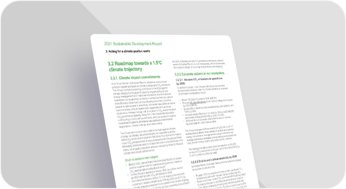 www.se.com Schneider Electric 74 2021 Sustainable Development Report 3 A cting for a climate positive world 3.2 Roadmap towards a 1.5°C climate trajectory 3.2.1 C limate impact commitments In its Trust Charter, Schneider Electric adopts an unequivocal position regarding impact on climate change and CO 2 emissions. The Group has been a leading contributor to the fight against climate change for the past 15 years by implementing its own energy management and industrial automation solutions across operations, by supporting its clients in achieving their low-carbon and efficiency objectives, and by allowing more than 30 million people to gain access to electricity. Schneider also takes an active role in a variety of multi-stakeholder organizations to promote solutions to climate change, call for a price to CO 2 , and strengthen CO 2 governance globally. Since 2011, the Group has also been contributing to the Livelihoods Funds, which proposes innovative investment models to simultaneously address environmental degradation, climate change, and rural poverty. The Group aims to be a role model in the fight against climate change, by sharply decarbonizing its own operations and by delivering services and solutions that allow its customers to reduce more CO 2 emissions than those produced by the Group’s activities. Ultimately Schneider aims to reduce the end-to-end emissions of its offers, by engaging suppliers and eco-designing offers for lifecycle climate and circular performance. Short to medium-term targets • B efore 2025, demonstrate that Schneider Electric is carbon positive together with its customers and partners, thanks to CO 2 savings delivered by EcoStruxure ™ . • O n the Group’s operations (scope 1&2): be carbon neutral by 2025 and net-zero CO 2 emissions by 2030. • O n indirect emissions (scope 3) in its supply chain and with customers: reduce emissions by 35% by 2030 (vs 2017), by actively engaging suppliers to accelerate their climate strategy, by sourcing greener materials, and by proposing more efficient solutions to its customers. The Group’s 2030 targets (net-zero CO 2 emissions on scope 1 and 2, and -35% on scope 3) have been validated 1.5°C-aligned by the Science-Based Target initiative in 2019. Long-term targets • B ecome carbon neutral on the Group’s full end-to-end footprint by 2040 (scopes 1, 2 and 3), 10 years ahead of 1.5°C trajectory. This means that all Schneider’s products will be carbon neutral in 2040. • E ngage with suppliers towards a net-zero CO 2 supply chain by 2050. In 2040, the Group commits that all Schneider Electric products will be carbon neutral. By connecting technology, business, and collaboration, Schneider joins the likes of global partners, such as Amazon, Infosys, and Daimler to help deliver carbon neutrality by 2040 as part of the Climate Pledge, a jointly created initiative between Global Optimism and Amazon. The Climate Pledge was founded on the conviction that global businesses are responsible and accountable for acting on the climate crisis, together. This milestone is set 10 years earlier than the pledge made in 2015 by all United Nations country members at Paris COP21, showing the Group’s eagerness to accelerate the world economy decarbonization to respect the 1.5°C targets. By 2050, achieving net-zero CO 2 emissions in its supply chain will require Schneider Electric to work transversally with all stakeholders, from product design, to sourcing, manufacturing and shipping. 3.2.2 Concrete actions in our ecosystem 3.2.2.1 N et-zero CO 2 emissions in operations by 2030 To deliver its Scope 1 and 2 targets, the Group has launched several transformations under the Climate and Resources pillars of Schneider Sustainability Impact: • R each 150 Zero-CO 2 sites by 2025 (SSE #1), • Propose SF 6 -free alternatives for all medium voltage techno logies b y 2025 (SSE #2), • Source 90% of electricity from renewables by 2025 (SSE #3), and 1 00% by 2030, • Increase energy efficiency in our sites by 15% by 2025 (SSE #5) and double energy productivity by 2030 (vs 200 5), • Shift one third of corporate vehicle fle et to electric vehicles by 2025 (SSE #7), and 100% by 2030. The Group leverages its Power and Building EcoStruxure ™ IoT architectures to deliver these ambitions, monitor and optimize energy consumption, manage assets and grid infrastructure, manage distributed renewable energy resources and electricity load, monitor energy quality, and power electric vehicles. This strategy has delivered an absolute reduction of 405,028 tonnes of CO 2 e emissions on Scope 1 and 2 (from 699,079 tCO 2 e in 2017), which is a 58% decrease. 3.2.2.2 End-to-end carbon neutrality by 2040 Schneider Electric is already taking concrete actions to engage its suppliers to decarbonize: • E ngage 1,000 top suppliers to reduce their operational CO 2 e missions by 50% with The Zero Carbon project (SSI #3). • R educe purchase-related CO 2 emissions with EcoDesign Way ™ t o improve the end-to-end lifecycle environmental footprint of its offers, notably by reducing and substituting materials and components in products. The Group aims to source 50% green materials by 2025, favoring bio-sourced, recycled, and sustainable options (SSI #4). • H ave 100% of its primary and secondary packaging free from single-use plastics and made from recycled cardboard (SSI #5). • R educe CO 2 emissions from freight and logistics activities, by shifting from air to sea freight and optimizing fill rates and travel routes (SSE #4). • R educe CO 2 emissions from waste management, with its “Waste as Worth” program. In 2021, 126 sites achieved the “Waste to Resources” designation as part of SSE #9. • R educe CO 2 emissions from capital goods by optimizing real estate space occupancy as saved surfaces translate directly into lower CO 2 emissions, as well as spared natural habitats and agricultural land.