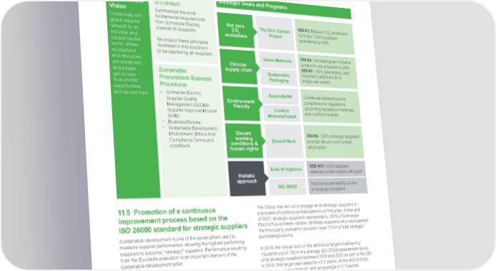 www.se.com Schneider Electric 28 2021 Trust Report Schneider Electric’s sustainable procurement strategy When it comes to procurement, Sustainability is at the very heart of our mission. To streamline global action, we have implemented a Sustainable Procurement Strategy, which was the result of a multi-stakeholder consultation process. This strategy is focused on a vision of collaboration with our global supplier network to build an inclusive and carbon neutral world, where ecosystems and resources are preserved, and people get access to economic opportunities and decent lives. The strategy rests on the foundation of robust procurement processes, that embed sustainability criteria at various stages and de-risk the operations by adhering to the relevant legal and prevailing norms. Net zero CO 2 emissions Circular supply chain Environment friendly Decent working conditions & human rights Holistic approach Strategic Goals and Programs Sustainable Procurement Vision Collaborate with global supplier network for an inclusive and carbon neutral world, where ecosystems and resources are preserved, and people get access to economic opportunities and decent lives The Zero Carbon Project Supplier code of Conduct Summarizes the most fundamental requirements from Schneider Electric towards its Suppliers. We expect these principles illustrated in this document to be applied by all suppliers. Sustainable Procurement Business Procedures • Schneider Electric Supplier Quality Management (SSQM)/ Supplier Approval Module (SAM) • Business Review • Sustainable Development, Environment, Ethics And Compliance Terms and conditions Green Materials Reach/RoHS ISO 26000 Sustainable Packaging Conflict Minerals/Cobalt Duty of Vigilance Decent Work SSI #3: Reduce CO 2 emissions from top 1,000 suppliers’ operations by 50% SSI #4: Increase green material content in our products to 50% SSI #5: 100% packaging uses recycled cardboard & no single-use plastic Continued adherence and compliance to regulations governing hazardous materials and conflict minerals SSI #6: 100% strategic suppliers provide decent work to their employees Improve sustainability profile of strategic suppliers SSE #17: 4,000 suppliers assessed under Vigilance Program 11.5 Promotion of a continuous improvement process based on the ISO 26000 standard for strategic suppliers Sustainable development is one of the seven pillars used to measure supplier performance, allowing the highest-performing suppliers to become “strategic” suppliers. Performance resulting from the EcoVadis evaluation is an important element of the sustainable development pillar. The ISO26000 evaluation by EcoVadis remains one of the key aspects of Schneider Electric’s supply chain and procurement-led sustainable development strategy. The elements of the assessment are an integral part of the business reviews scheduled between buyers and suppliers, on a quarterly to yearly basis, depending on the suppliers. This monitoring supposes an improvement from the supplier. The Group has set out to engage all its strategic suppliers in a process of continuous improvement on this pillar. At the end of 2021, strategic suppliers represented c. 60% of Schneider Electric’s purchases volume. Strategic suppliers who have passed the third-party evaluation process cover 70%+ of total strategic purchasing volume. In 2018, the Group took on the ambitious target of achieving +5 points out of 100 in the average ISO 26000 assessment score of its strategic suppliers between 2018 and 2020 as part of the SSI. In 2019, this target was raised to +5.5 points. At the end of 2020, +6.3 points were achieved, with an average of 57.4 points. 2021 target was set at +1 point minimum, and the end of year result was +1.3 points with an average of 58.7 points. The new ambition for 2021 – 2025 is to raise the bar even higher to achieve an average of 65 points within 5 years.