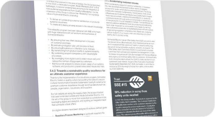 www.se.com Schneider Electric 14 2021 Trust Report 5.4 Due diligence and results The Group policy is supported by a robust Quality Management System, which is improved continuously to fulfill expectations of all relevant parties. It is in full alignment with our Trust Charter, Schneider Electric’s Code of Conduct, as well as in compliance with ISO 9001 standard. In 2021, 231 Schneider supply chain sites were certified to ISO 9001. 5.4.1 Reliability as a signature of Schneider Electric To ensure improvement in the area of design, the Group launched in mid-2020, a dedicated program, ReeD (Reliability End To End byDesign), to secure fundamentals and ensure full integration of new customer expectations (from Quality to Reliability). It is the obsession of the Group to ensure that “Reliability” is a signature value of Schneider Electric branding: • To deliver an outstanding customer satisfaction on products/ systems robustness • To create and deploy an easy access to the relevant knowledge This reliability program has been designed with R&D at its heart, with huge interactions with all functions and businesses of Schneider Electric: • By ensuring that new offers development is focused on customer promises. • By animating mitigation plan until deviation is fixed. • By ensuring Excellence in Offer Life Cycle changes. • By transitioning from product quality to systems reliability. • By combining people’s competency with robust digital processes. • By leveraging more digital tools to detect issues early and reduce the number of bugs seen by customers. • Reinforce risk analysis to ensure proper usage of our systems, software, and products to prevent associated issues and risks. 5.4.2 Towards a sustainable quality excellence for an ultimate customer experience Thanks to the implementation of a robustness program, Schneider Electric fosters a quality culture by boosting the basics to secure cultural transformation towards Sustainable Quality Excellence for premium customer experience through solid foundations such as people, organization, robustness, and suppliers. For full visibility all along the supply chain, the scope of action has been extended outside and inside Schneider Electric. It is the will of the group to move from a reactive to a predictive mode, leveraging digital and analytics, and building an integration layer that connects critical offers. Six digital streams have been designed to achieve defined goals: • Suppliers Process Monitoring to build with suppliers the capabilities of real time process control. • Manufacturing Process Monitoring to build with factories the capabilities of real time process control. • Logistics Process Monitoring to build the capability of real time process control in Schneider Electric’s logistics operations. • End-to-End Traceability to serialize, track, and trace Schneider Electric’s products. • Analytics & Optimization to leverage descriptive, predictive, and prescriptive analytics on data generated to get actionable insights to improve industrial quality. • Digitization of Processes to digitize processes for simplification, transparency, and robustness while capturing data for analytics. 5.4.3 Revalorising customer returns When sustainability supports Customer Satisfaction, it translates into new processes and policies to allow returns of adapted products for reuse, remanufacture and refurbishment. The strong collaboration between Sustainability, Global Supply Chain, Lines of Business and Customer Satisfaction and Quality teams imagine these new processes, enabling Schneider Electric to revalorize customers returns through reuse of components or remanufacture of new products in Local Adaptation Centers. The benefits can be seen at customer satisfaction level: by producing and delivering back order impacted by components in shortages, by serving new customers orders and on Sustainability level with anticipation of upcoming regulation compliance (Anti-Waste law), reducing carbon footprint of our supply chain and reducing cost of non quality due to product scrap. Schneider Electric has an Offer Safety Alert (OSA) process to alert the relevant Line of Business and other interested parties as soon as it is suspected that customers’ health or property safety may be put at risk by Schneider products, solutions, or projects. The Offer Safety Alert Committee (OSAC) is a permanent corporate committee that oversees and regulates the management of OSA. Its mission is to ensure all OSA are managed with the due diligence and urgency to minimize safety risks to customers. Its independent, multi-discipline nature allows the OSAC to make decisions in our customers’ best interest. As part of the Trust pillar of Schneider Sustainability Essentials 2021-2025, Schneider is committed to reduce by 50% the weight of scrap from safety units recalled by 2025 (SSE #15). 50% reduction in scrap from safety units recalled In 2021 the Group recalled 14 products as approved by the Offer Safety Alert Committee. The Customer Satisfaction & Quality team reaches out to customers impacted by the recall to arrange for product replacement. Investigation will be conducted on products returned to Schneider’s premises to determine the final root cause of the safety issue. The returned product thereafter will be assessed on its reusability and parts which could not be reused will be scrapped according to the local environmental regulations. Tr ust SSE #15 2 ,101 4,202 Baseline 2025 target 2021 Progress 0 100 4,024