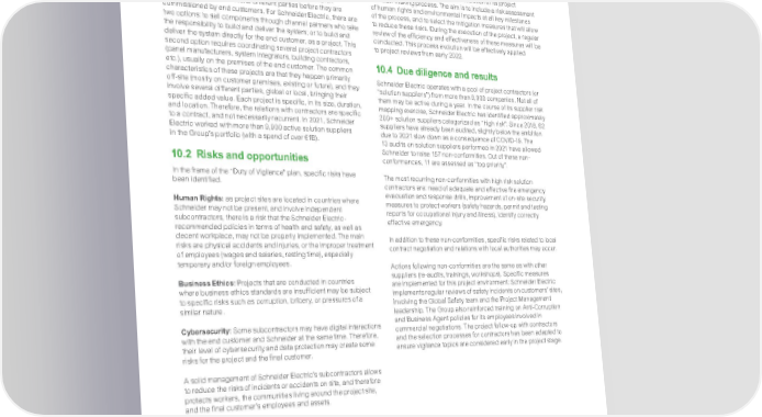 www.se.com Schneider Electric 26 2021 Trust Report 10 Relations with project execution contractors 10.1 Project execution environment Schneider Electric’s products and solutions are usually combined into larger systems such as electricity distribution and energy management in a building, or production process automation in a factory. The build-up of such systems can be complex and typically involves several different parties before they are commissioned by end customers. For Schneider Electric, there are two options: to sell components through channel partners who take the responsibility to build and deliver the system; or to build and deliver the system directly for the end customer, as a project. This second option requires coordinating several project contractors (panel manufacturers, system integrators, building contractors, etc.), usually on the premises of the end customer. The common characteristics of these projects are that they happen primarily off-site (mostly on customer premises, existing or future), and they involve several different parties, global or local, bringing their specific added value. Each project is specific, in its size, duration, and location. Therefore, the relations with contractors are specific to a contract, and not necessarily recurrent. In 2021, Schneider Electric worked with more than 9,900 active solution suppliers in the Group’s portfolio (with a spend of over €1B). 10.2 Risks and opportunities In the frame of the “Duty of Vigilance” plan, specific risks have been identified. Human Rights: as project sites are located in countries where Schneider may not be present, and involve independent subcontractors, there is a risk that the Schneider Electric- recommended policies in terms of health and safety, as well as decent workplace, may not be properly implemented. The main risks are physical accidents and injuries, or the improper treatment of employees (wages and salaries, resting time), especially temporary and/or foreign employees. Business Ethics: Projects that are conducted in countries where business ethics standards are insufficient may be subject to specific risks such as corruption, bribery, or pressures of a similar nature. Cybersecurity: Some subcontractors may have digital interactions with the end customer and Schneider at the same time. Therefore, their level of cybersecurity and data protection may create some risks for the project and the final customer. A solid management of Schneider Electric’s subcontractors allows to reduce the risks of incidents or accidents on site, and therefore protects workers, the communities living around the project site, and the final customer’s employees and assets. 10.3 Group policy As part of its Duty of Vigilance program, Schneider Electric has deployed a policy of identification of risky subcontractors and implemented an on-site audit program. The results are described in the “Due diligence and results” section below. In 2021, to further anticipate and reinforce its risk mitigation measures, the Group introduced an evolution of its project decision-making process. The aim is to include a risk assessment of human rights and environmental impacts at all key milestones of the process, and to select the mitigation measures that will allow to reduce these risks. During the execution of the project, a regular review of the efficiency and effectiveness of these measures will be conducted. This process evolution will be effectively applied to project reviews from early 2022. 10.4 Due diligence and results Schneider Electric operates with a pool of project contractors (or “solution suppliers”) from more than 9,900 companies. Not all of them may be active during a year. In the course of its supplier risk mapping exercise, Schneider Electric has identified approximately 200+ solution suppliers categorized as “high risk”. Since 2018, 62 suppliers have already been audited, slightly below the ambition due to 2021 slow down as a consequence of COVID-19. The 13 audits on solution suppliers performed in 2021 have allowed Schneider to raise 157 non-conformities. Out of these non- conformances, 11 are assessed as “top priority”. The most recurring non-conformities with high risk solution contractors are: need of adequate and effective fire emergency evacuation and response drills, improvement of on-site security measures to protect workers (safety hazards, permit and testing reports for occupational injury and illness), identify correctly effective emergency. In addition to these non-conformities, specific risks related to local contract negotiation and relations with local authorities may occur. Actions following non-conformities are the same as with other suppliers (re-audits, trainings, workshops). Specific measures are implemented for this project environment: Schneider Electric implements regular reviews of safety incidents on customers’ sites, involving the Global Safety team and the Project Management leadership. The Group also reinforced training on Anti-Corruption and Business Agent policies for its employees involved in commercial negotiations. The project follow-up with contractors and the selection processes for contractors has been adapted to ensure vigilance topics are considered early in the project stage.